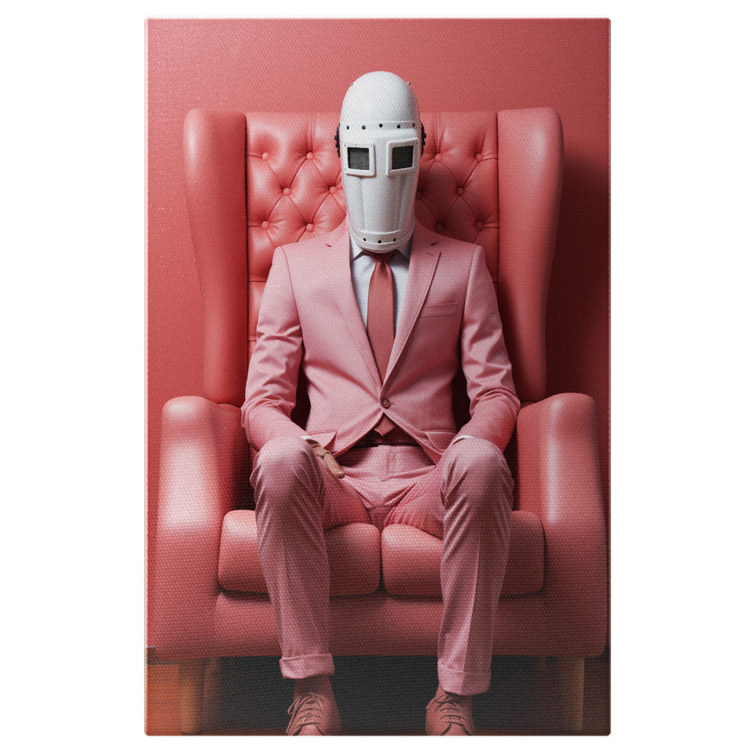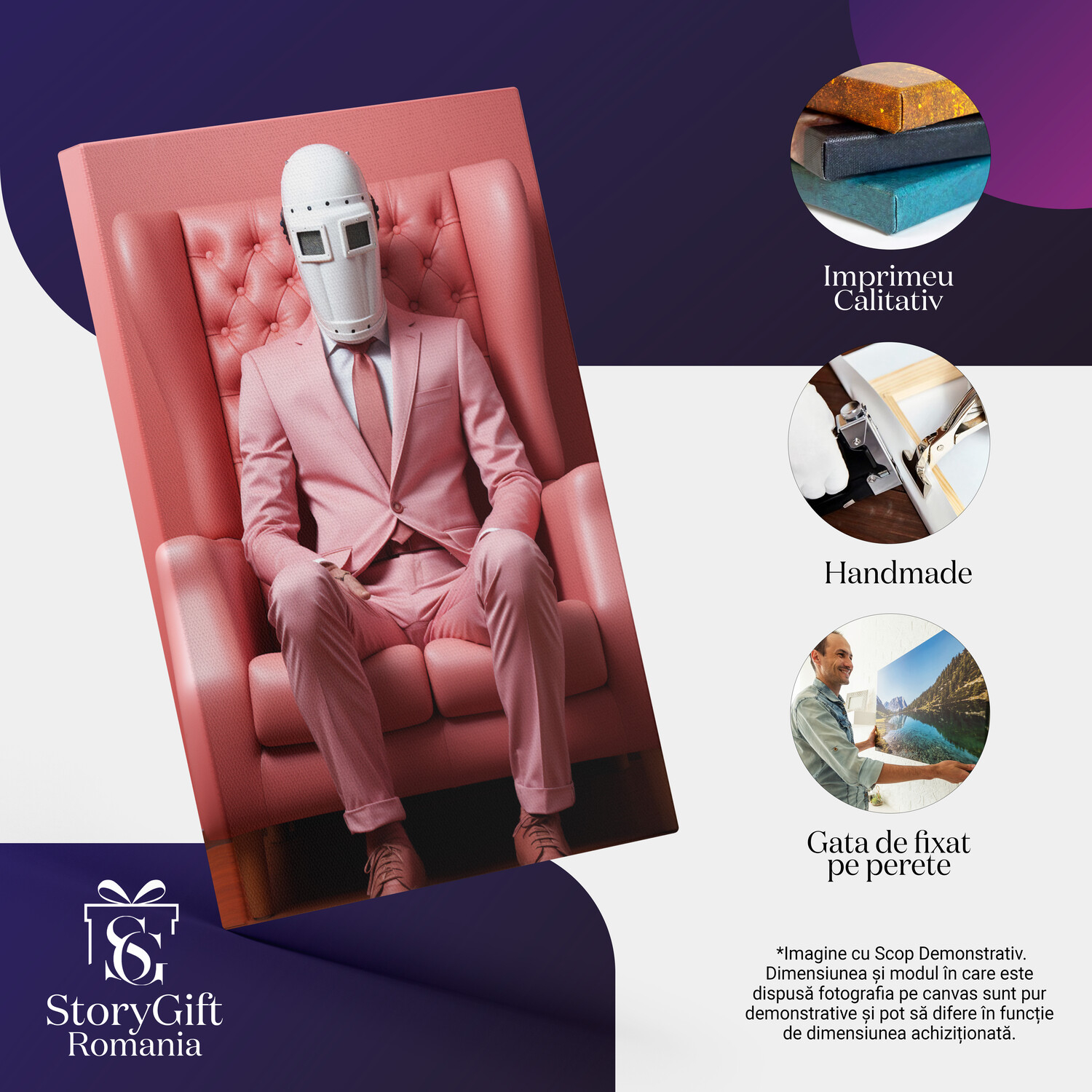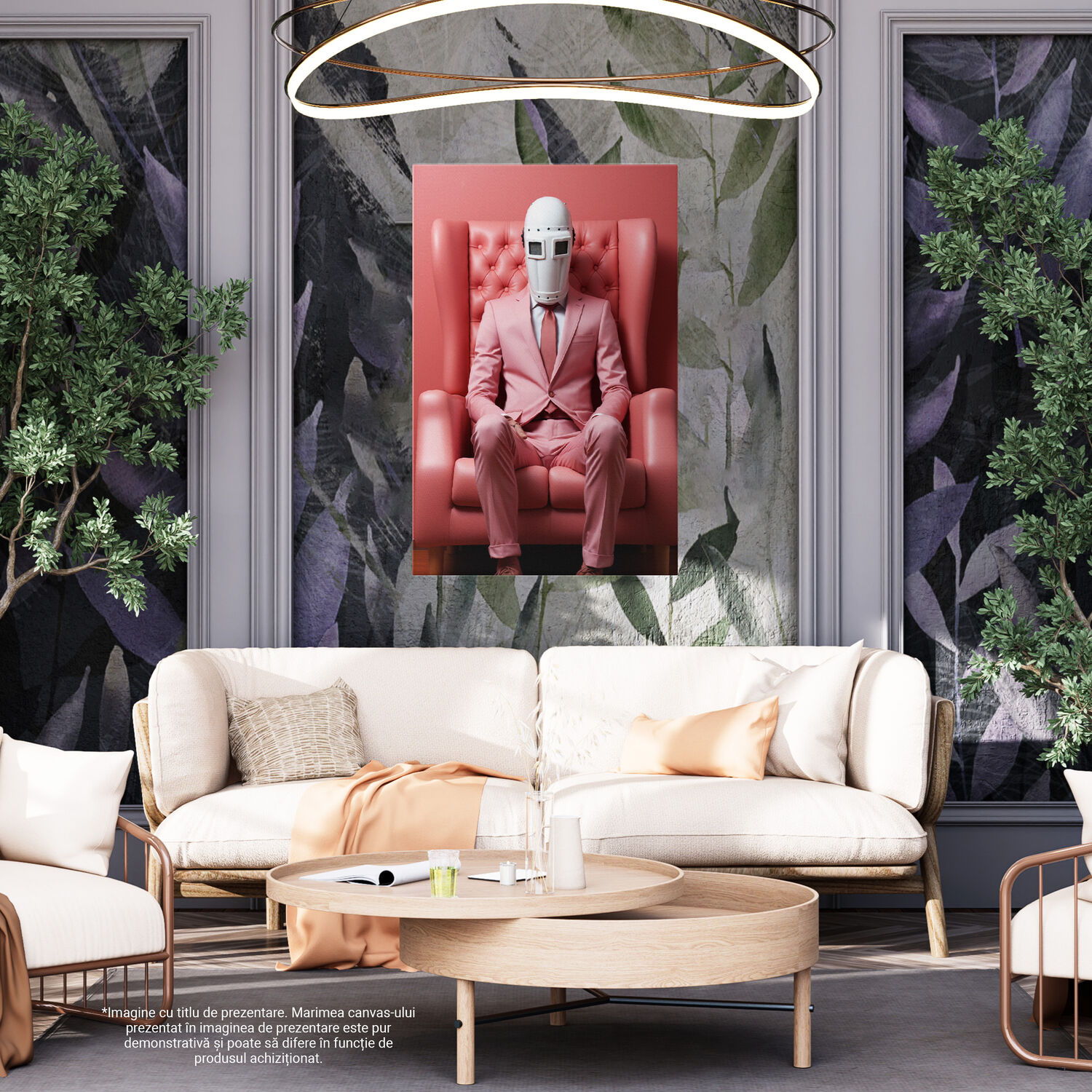 Tablou Canvas: Fotografie cu un barbat care sta intr-un fotoliu - masca alba costum roz Pictura Digitala - Tablou Canvas Signature de la StoryGift Romania