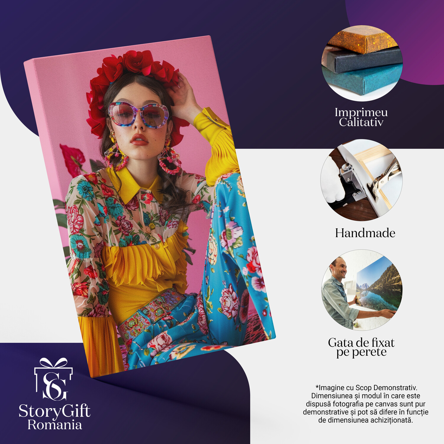 Tablou Canvas Imbracaminte Vesela, Tanara cu Cercei si Buze Rosii cu Ochelari si Coronita din Trandafiri , Pictura Digitala - Tablou Canvas Signature de la StoryGift Romania