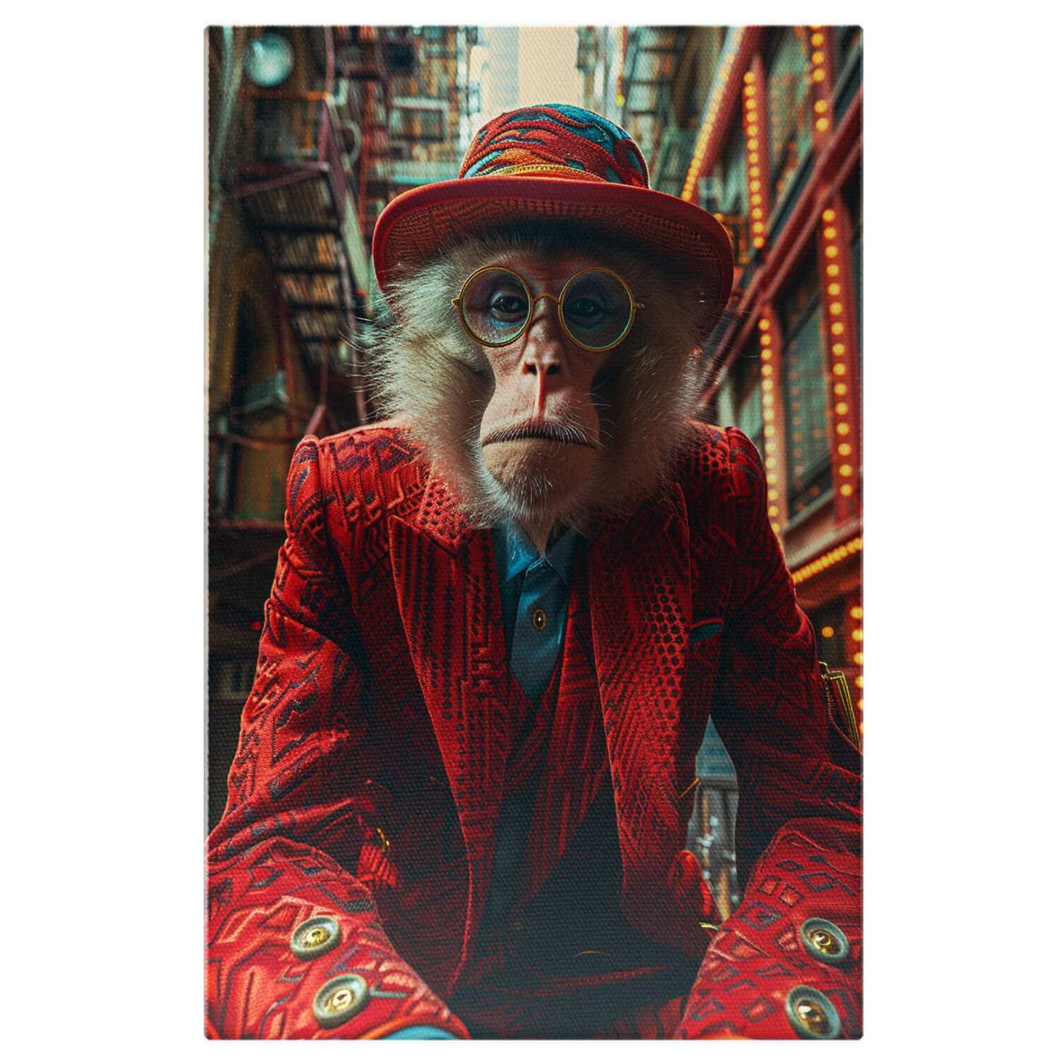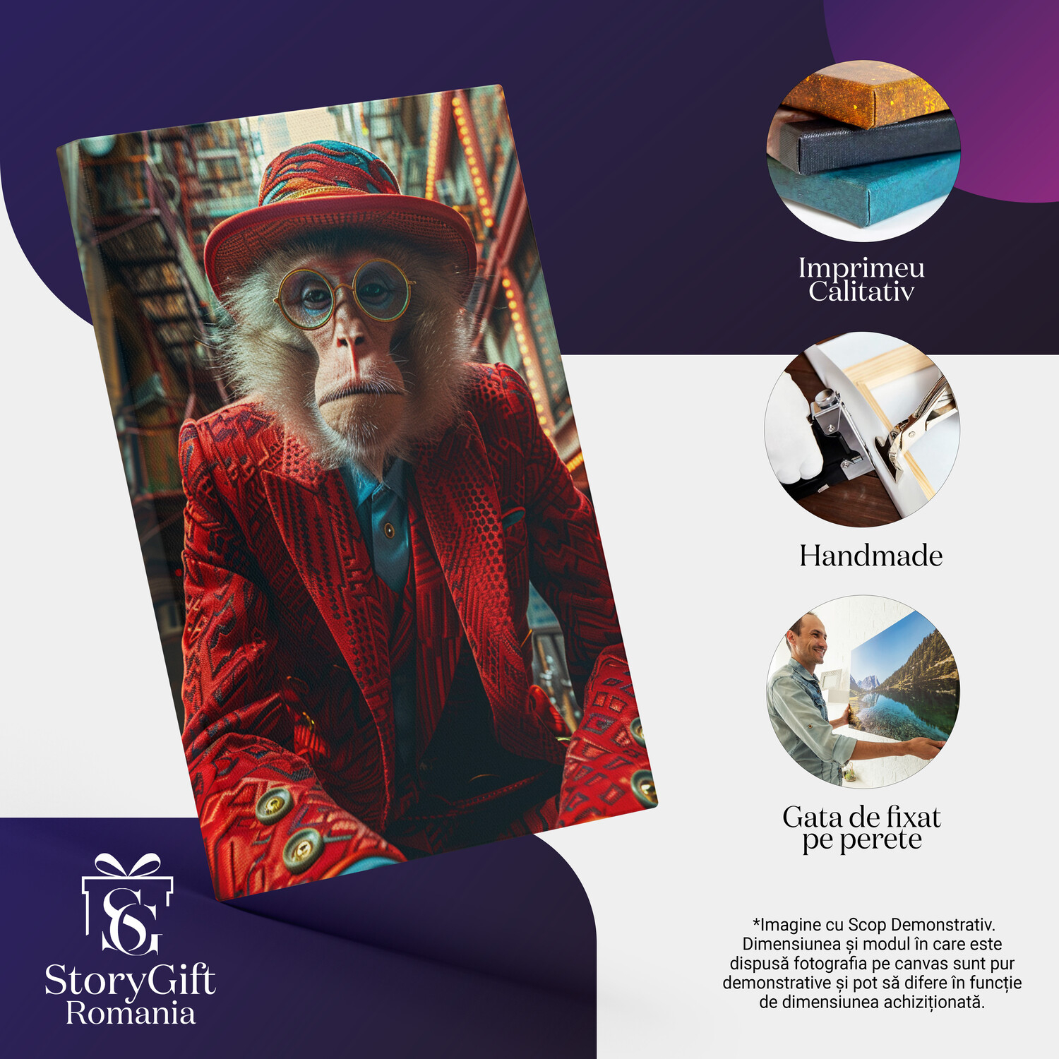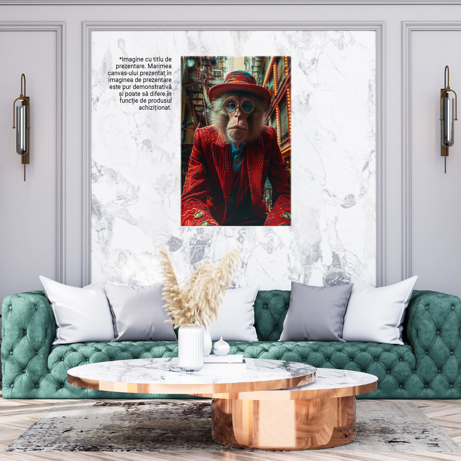 Tablou Canvas White Monkey cu Palarie si Ochelari in Camasa si Sacou Rosu cu Nasturi si Pantaloni , Pictura Digitala - Tablou Canvas Signature de la StoryGift Romania