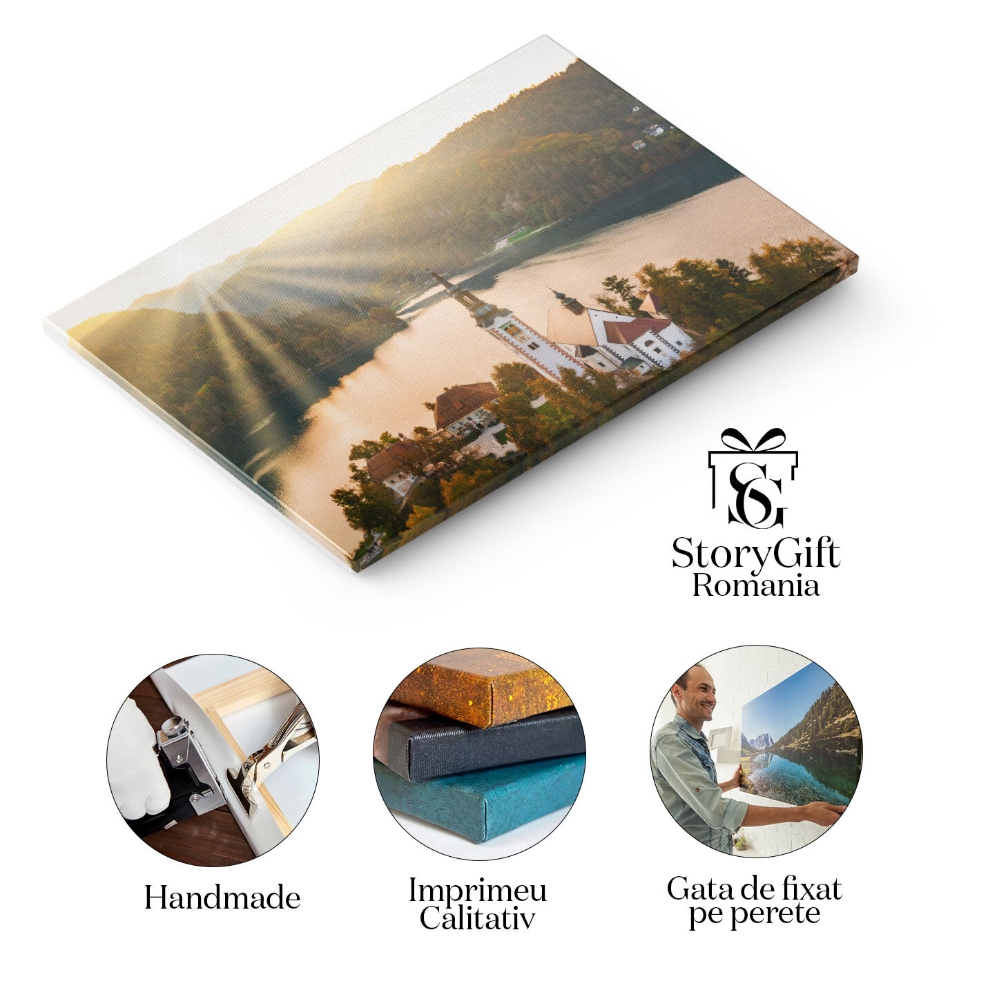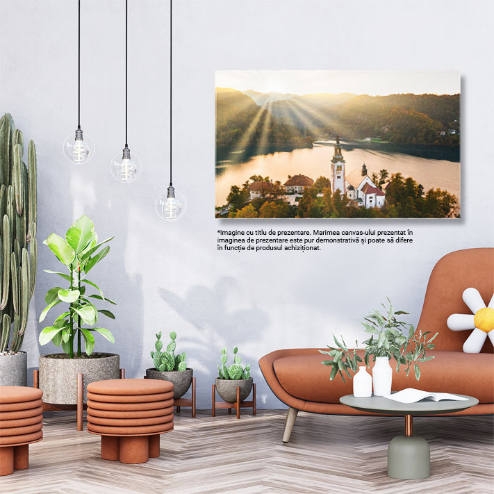 Tablou canvas cu peisaj, raze de soare, lac, cladiri, padure, multicolor 40x25CM