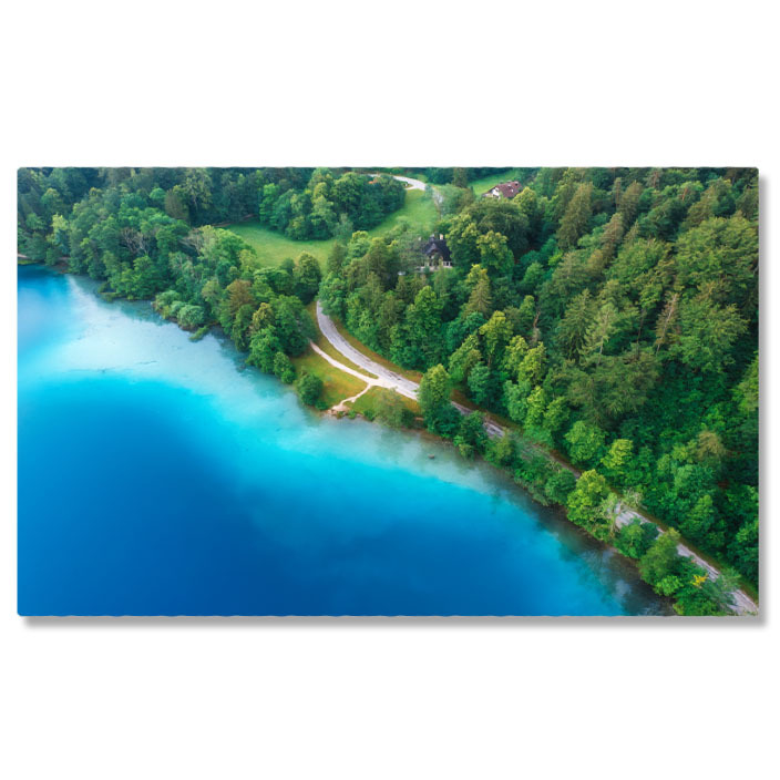 Tablou canvas cu lac, case, padure, natura, conifere, multicolor 40x25CM