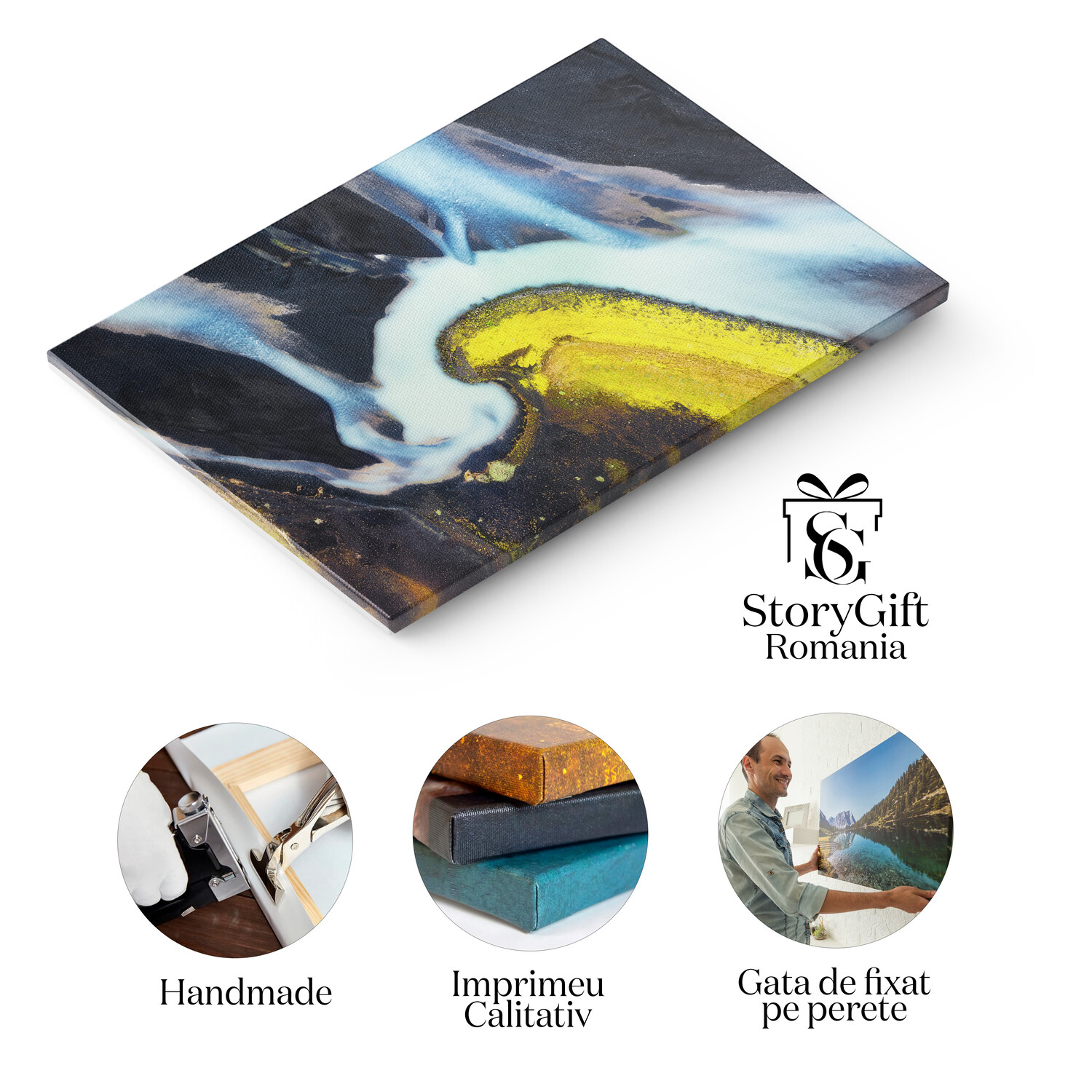 Construcția meticuloasă a tabloului evidențiază măiestria artizanală. Fiecare panză este manual tensionată pe un cadru de lemn, având colțurile rafinat finisate, oferind durabilitate și eleganță inconfundabilă.Când vine vorba de livrare, nu compromitem. Fiecare tablou este ambalat meticulos în protecții de lux și carton rigid, asigurând că tabloul ajunge în perfectă integritate la destinație.