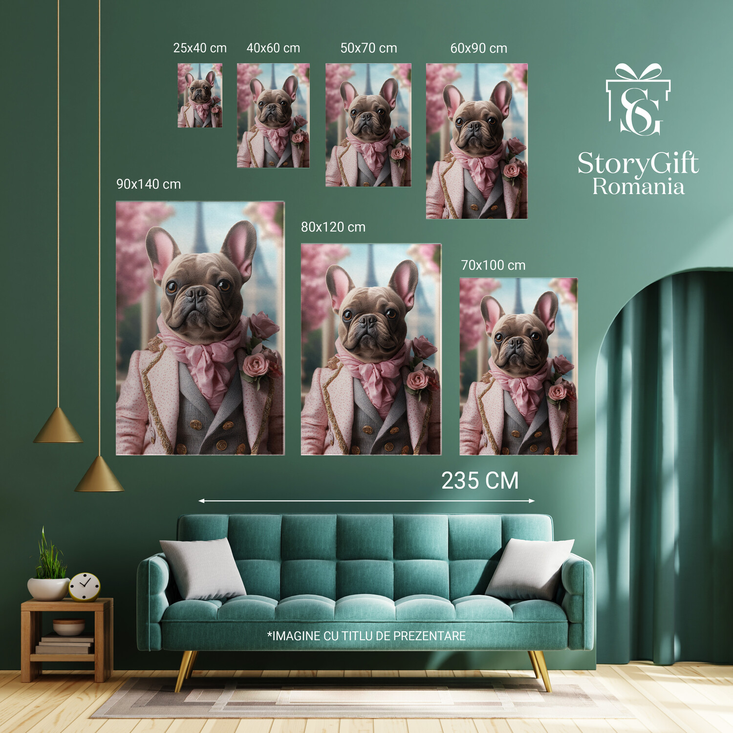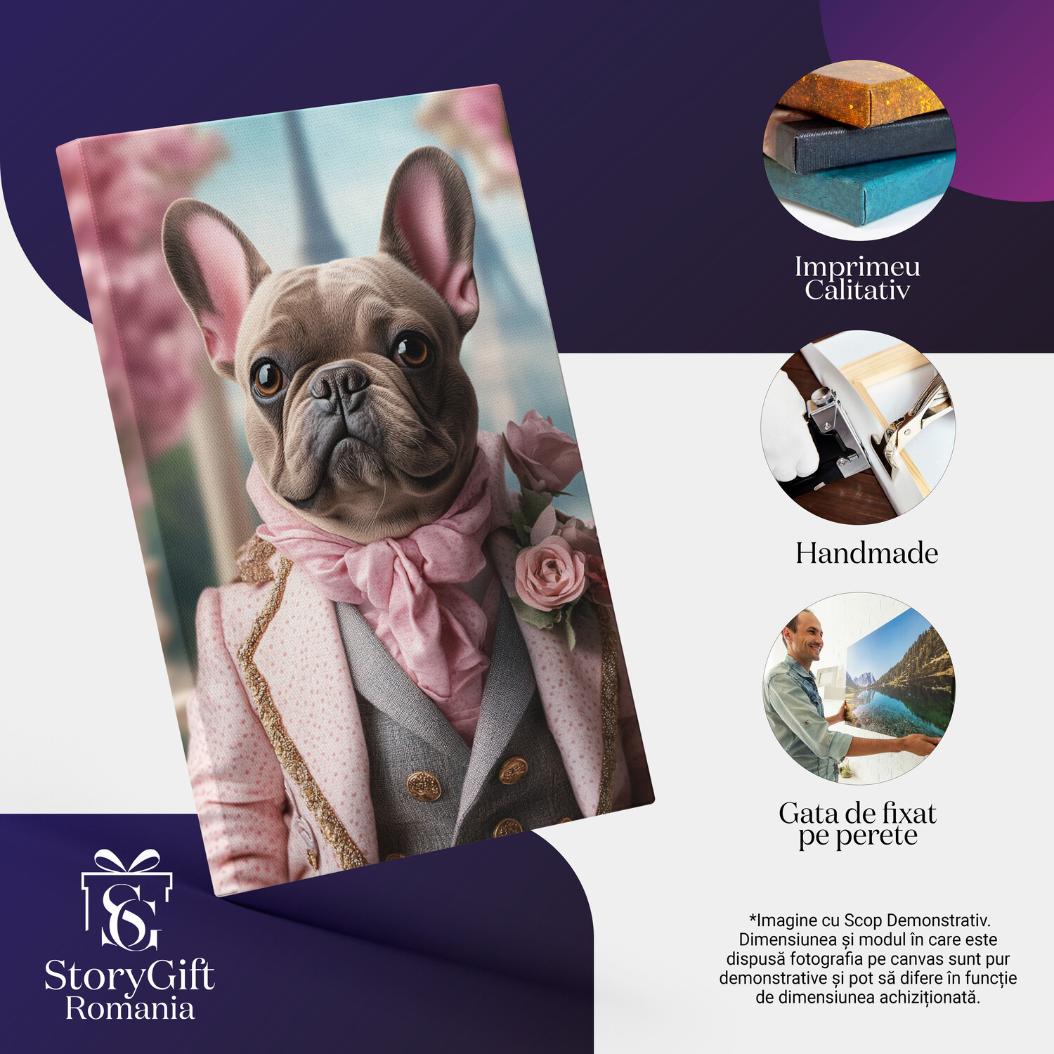 Tablou Canvas Personalizat Costum Roz Cu Detali Florale, Vesta Gri Cu Butoni Auri, Esarfa, Eleganta Fashion 100x70CM