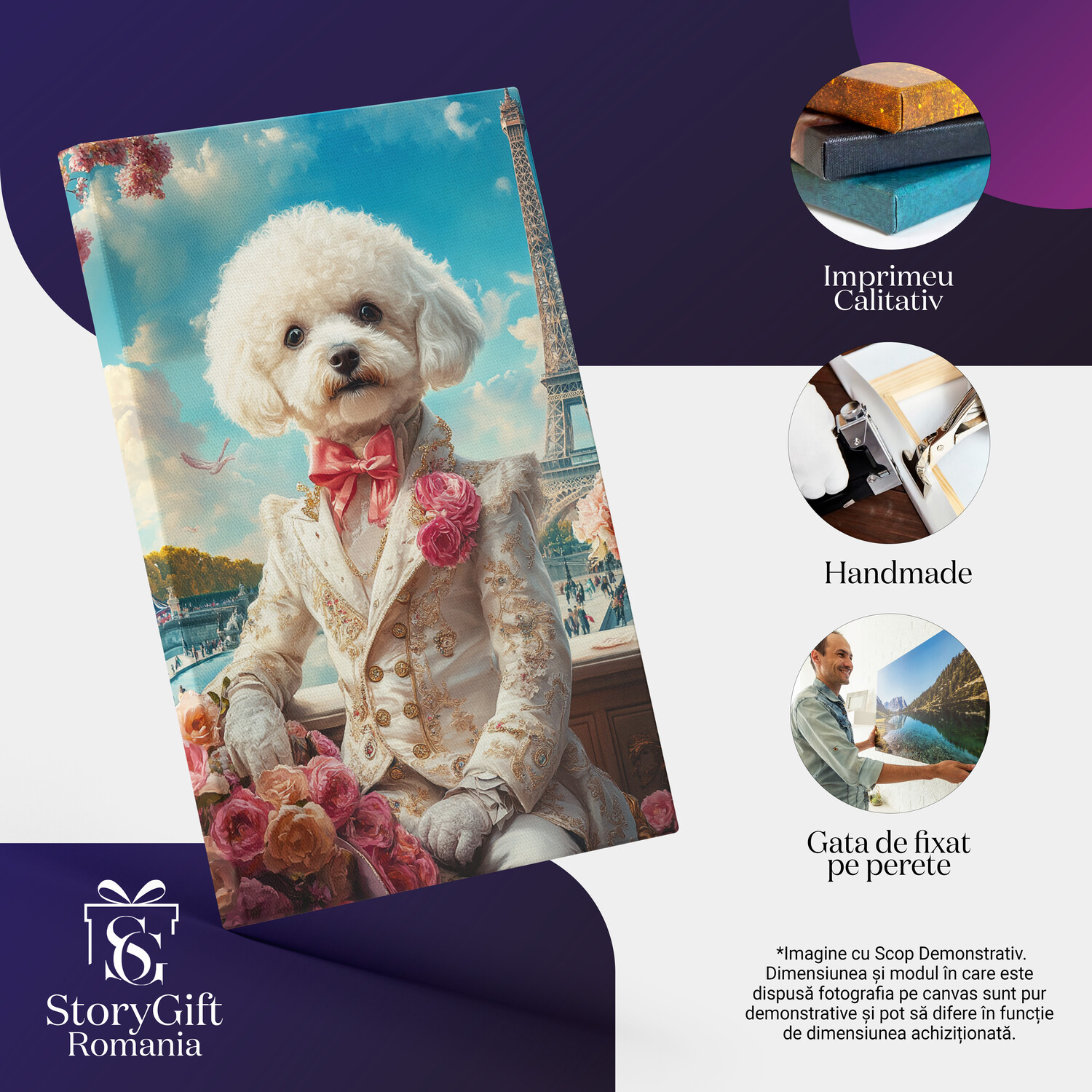 Tablou Canvas Personalizat Tinuta Eleganta Cu Jupon Alb Cu Detalii Aurii, Accesorii Regale, Papion Roz, Trandafir Roz, Turnul Eiffel 40x25CM
