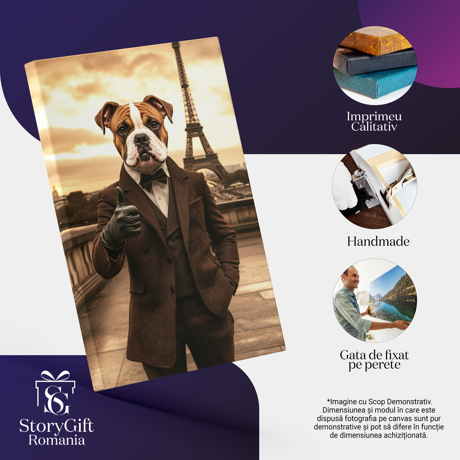 Tablou Canvas Personalizat Tinuta Masculina Eleganta Stil Aristrocrat In Paris, Vedere Turnul Eiffel, Costum maro, Semn Mana 40x25CM