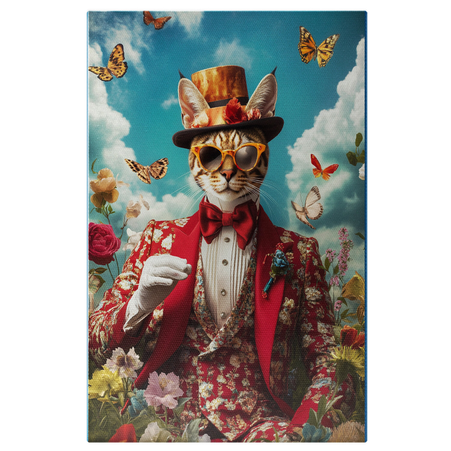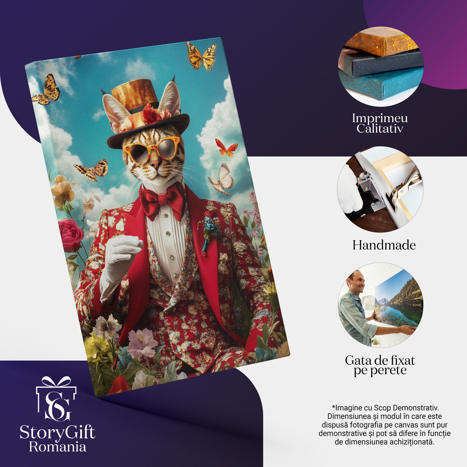 Tablou Canvas Personalizat Arta Abstracta Tinuta Moderna, Sacou Si Vesta Compleu Rosu Cu Detalii Florale, Papion Floare albastra in piept 90x60CM