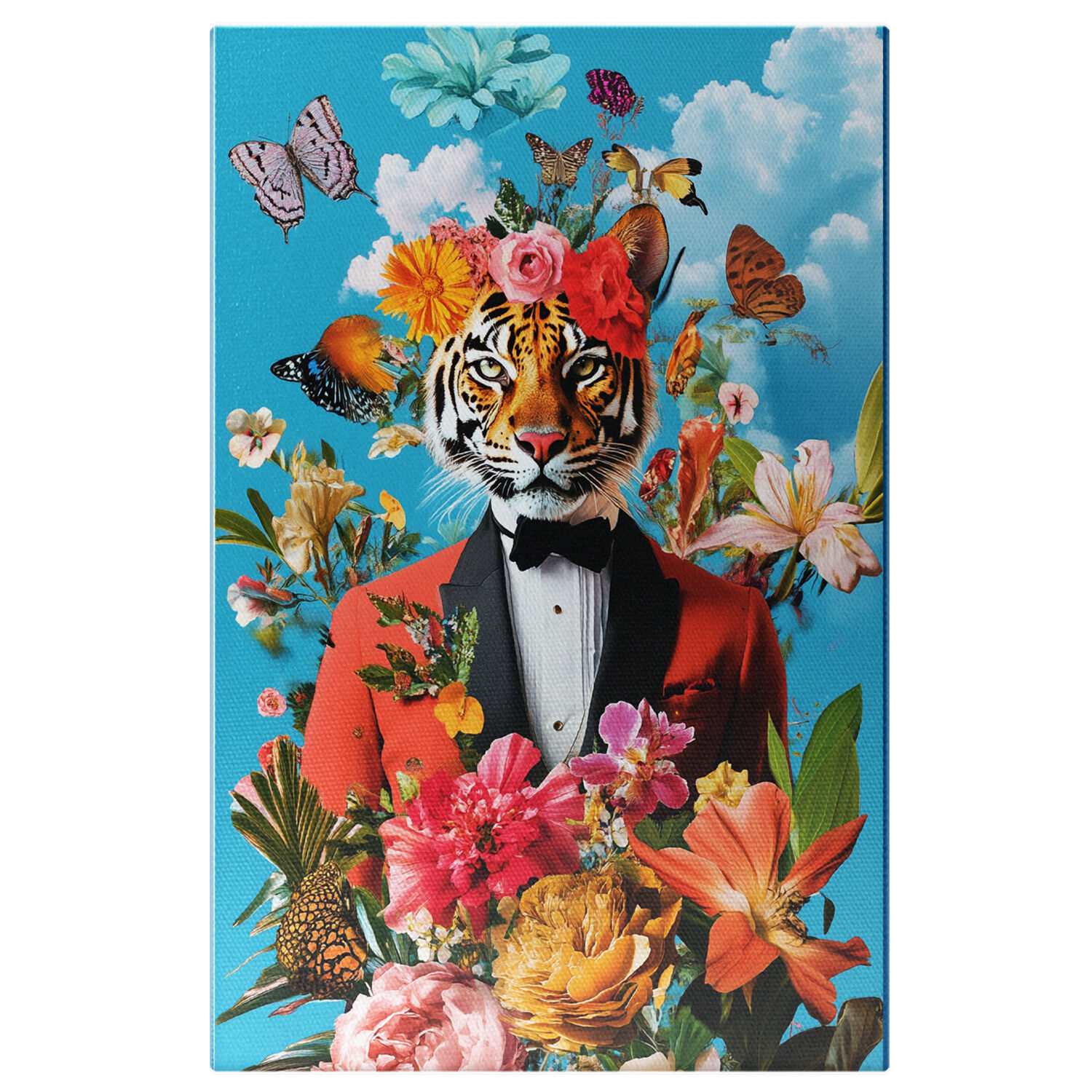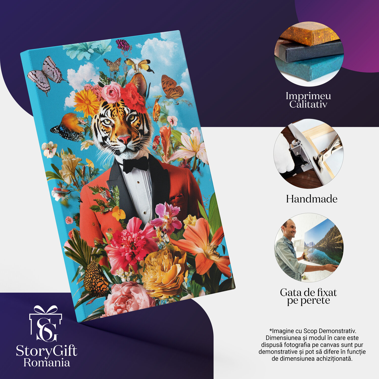 Tablou Canvas Personalizat Domn In Costum Rosu Cu Papion Negru si Camasa, In Cer Deasupra Norilor, Cadru Floral 70x50CM