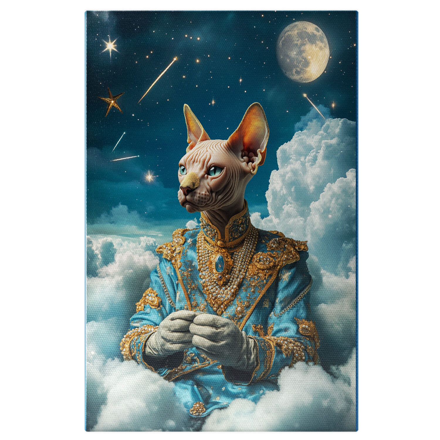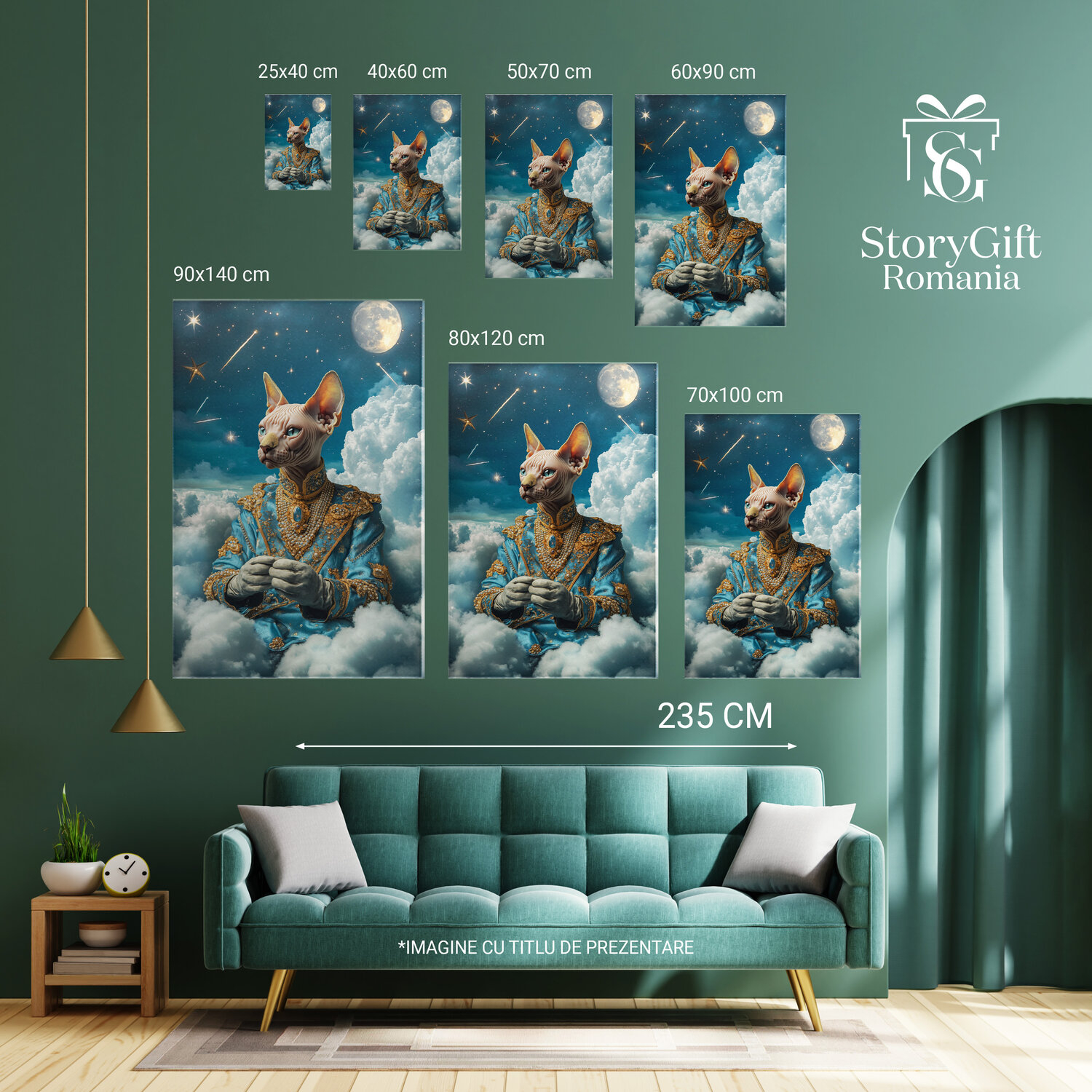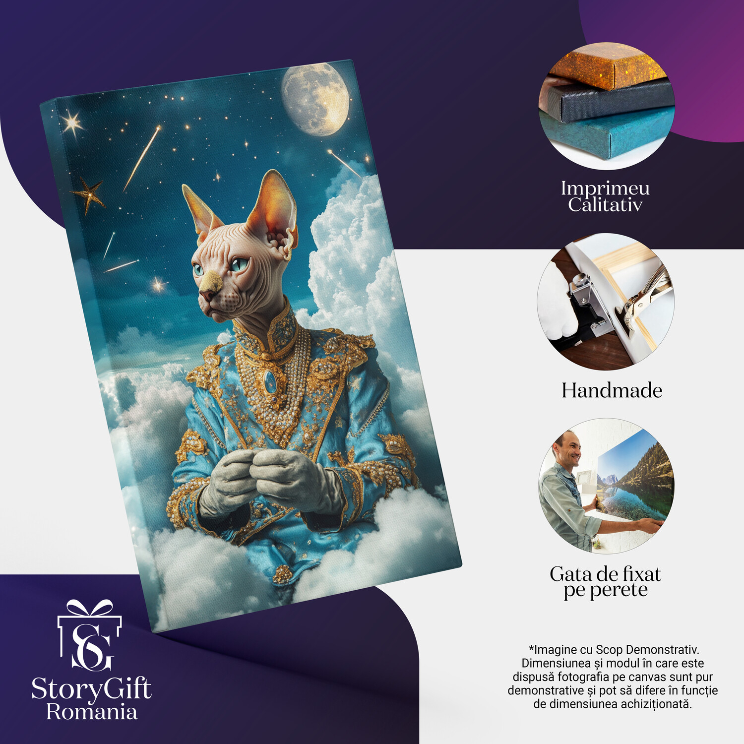 Tablou Canvas Personalizat Tinuta De Faraon regal Cu Accesori Masive Din Aur, Medalion cu Diamant Albastru, Deasupra Norilor Luna Plina 70x50CM