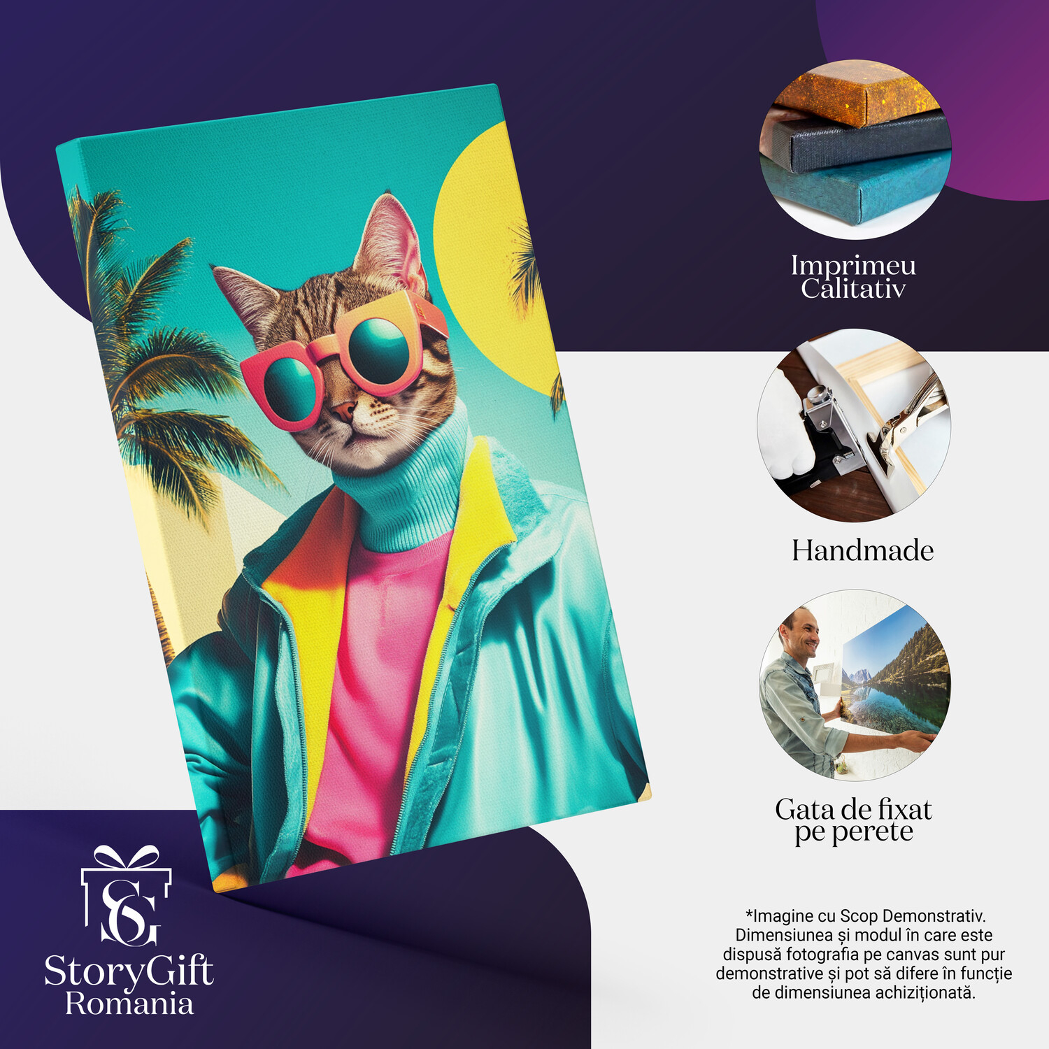 Tablou Canvas Personalizat Tinuta Moderna Vibranta, Helanca Cu Guler Inalt Albastru, Jacheta Albastru Cien, Palmieri Tropicali 40x25CM