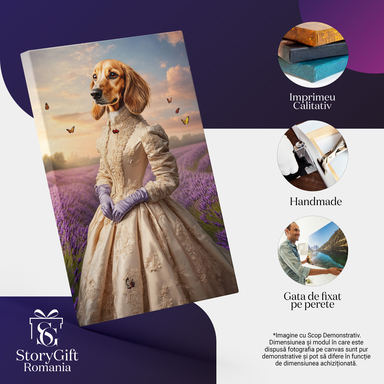 Tablou Canvas Personalizat Contesa In Lan de lavanda, Rochie Aurie Cu Detalii Cu Margele, Manusi Mov De Satin, Fluturi In Aer 90x60CM