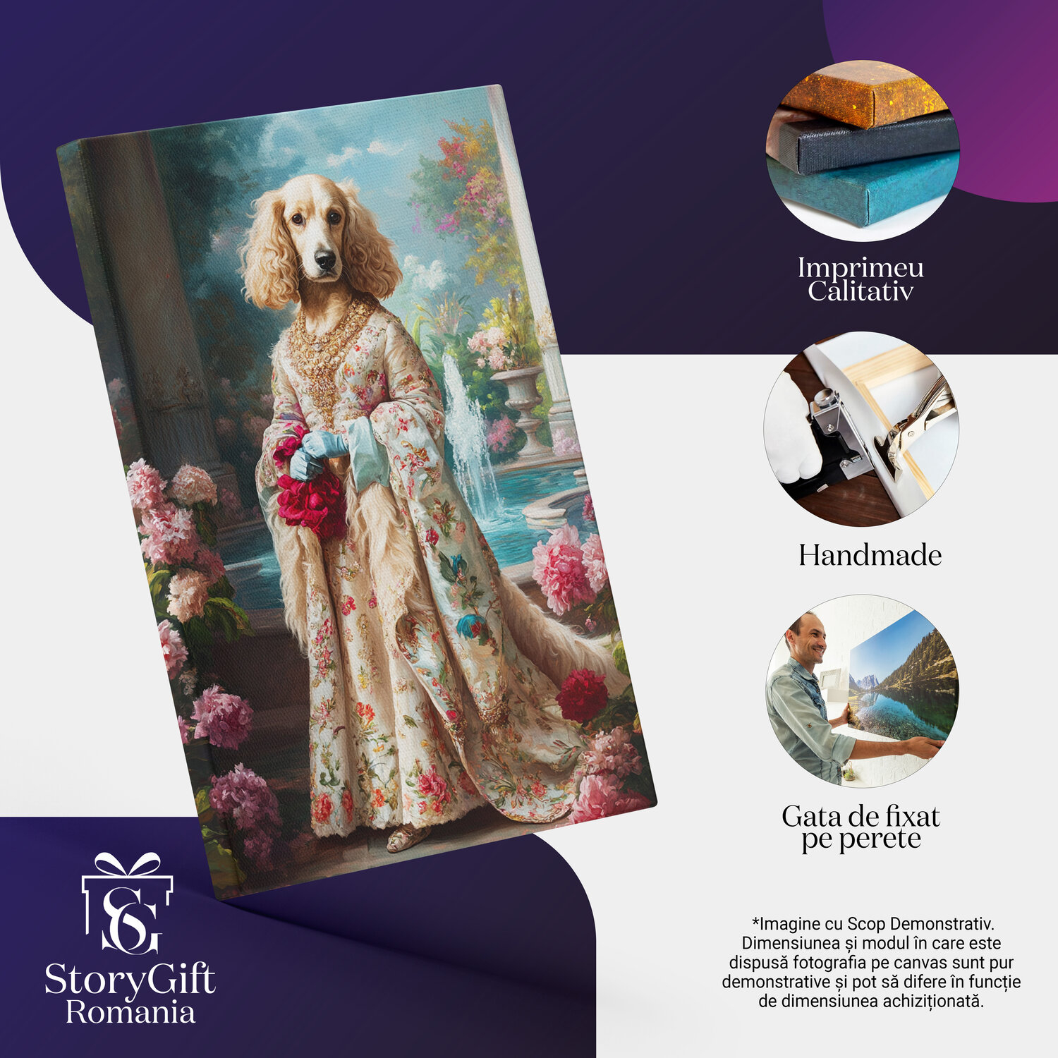 Tablou Canvas Personalizat Contesa Regala In Gradina Cu Flori Si Fantana, Tinuta Eleganta cU Medalion Masiv De Flori 40x25CM