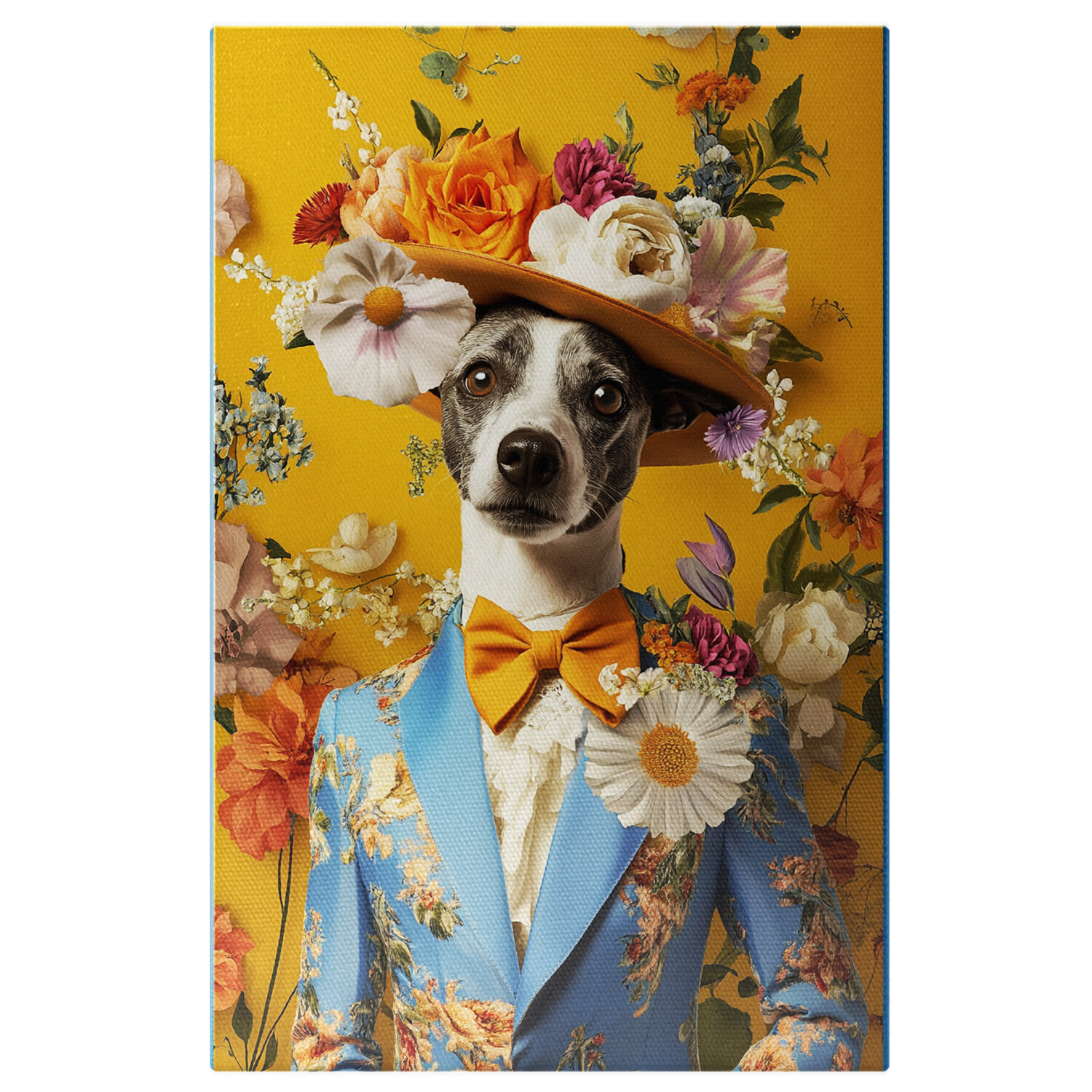 Tablou Canvas Personalizat Costum Modern Barbatesc Multitudine De Flori, Sacou Albastru, Papion Portocaliu si palarie 40x25CM