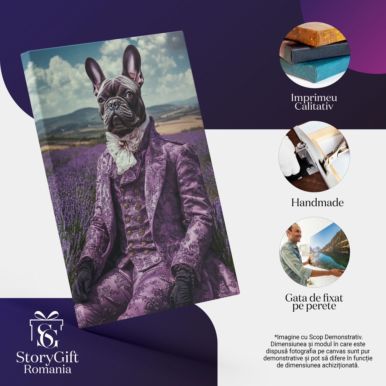 Tablou Canvas Personalizat Eleganta Aristrocrata In Lan De Lavanda, Costum Mov, Vesta Cu Butoni De Aur, Guler Inalt Stil Ruff 40x25CM