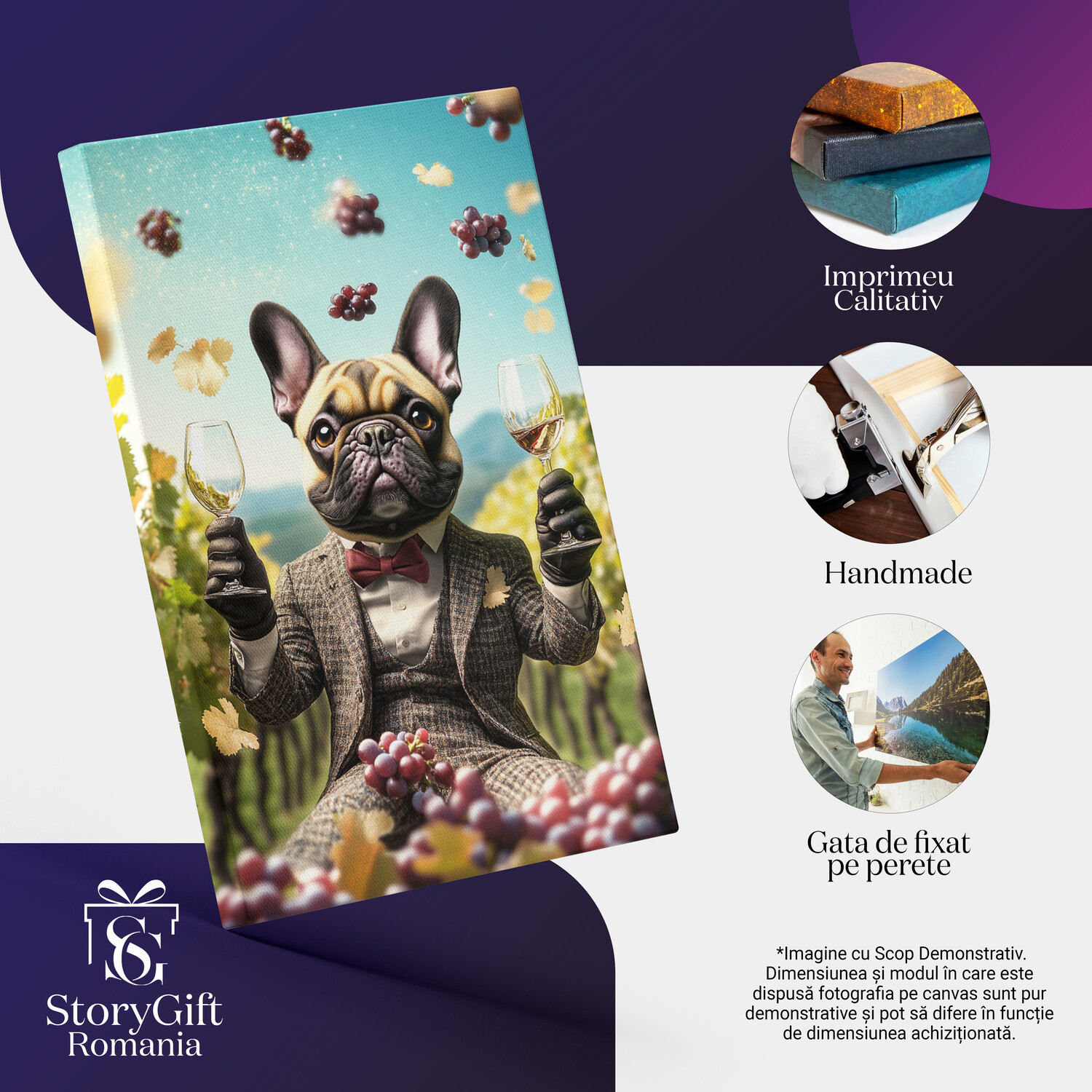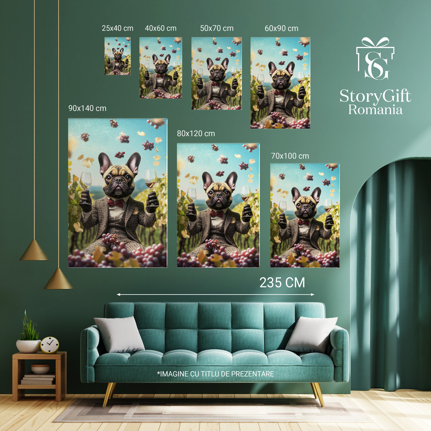 Tablou Canvas Personalizat Iubitor De Vinuri In Agricultura De Vie, Tnuta Eleganta in Carouri Cu Papion Visiniu, Struguri Zburatori 100x70CM