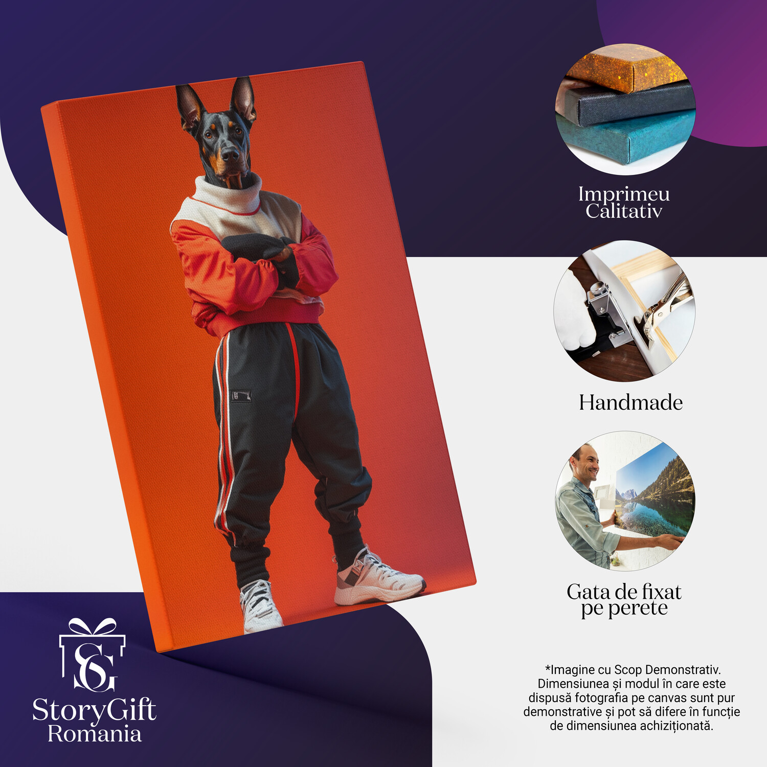 Tablou Canvas Personalizat Tinuta Sport Moderna, Bluza Cu Guler Inalt Rosie si Crem, Pantaloni Dtrenning Negri, Incaltaminte Sport 40x25CM