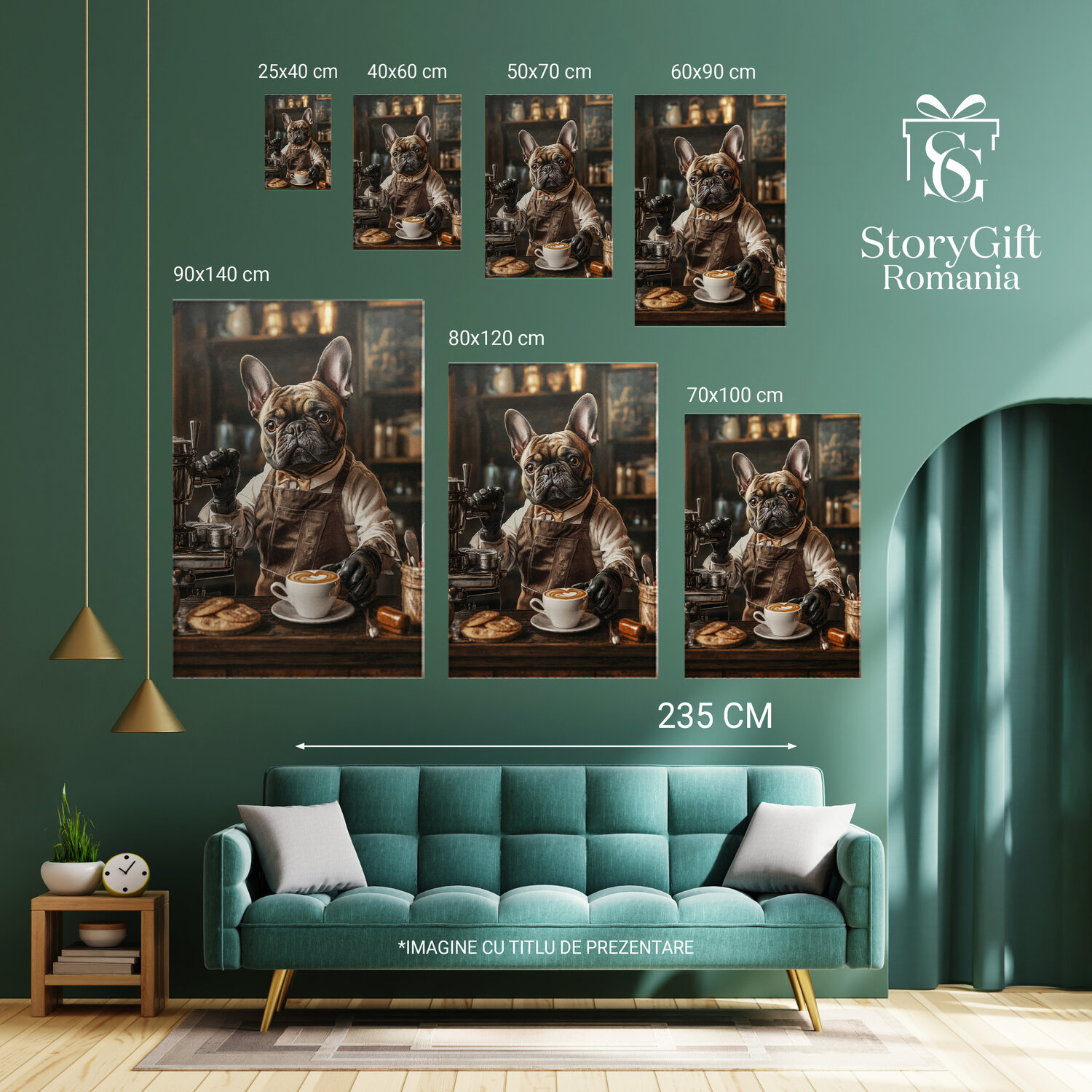 Tablou Canvas Personalizat Barista Cu Camasa Alba Si Halat Maro, Ceasca DE Cafea Cu Spuma, Iubitorii De Aroma 40x25CM