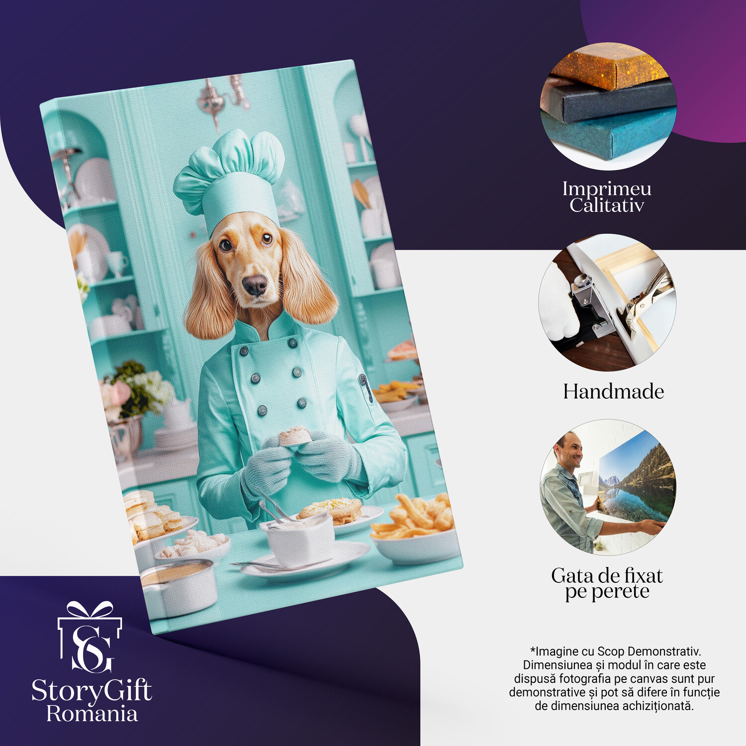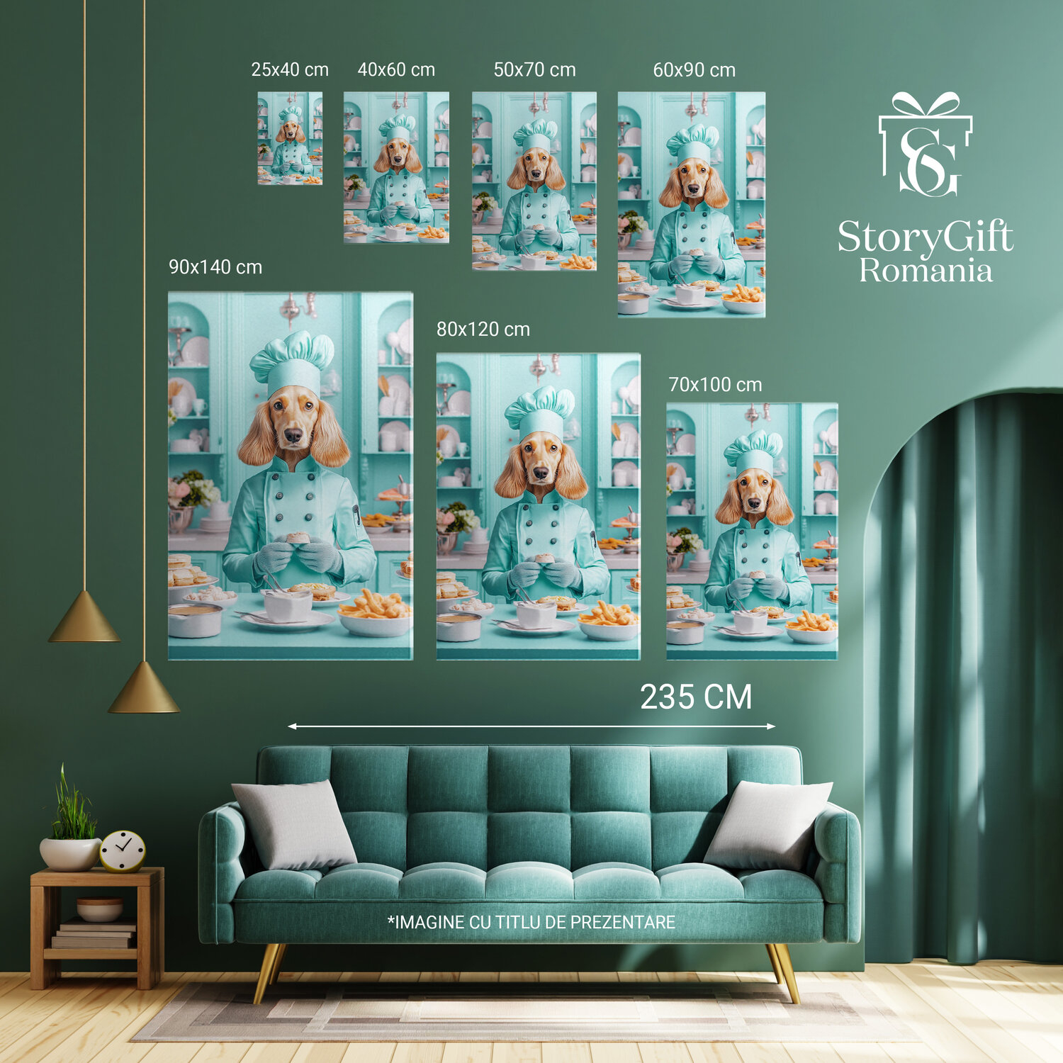Tablou Canvas Personalizat Bucatar Cheff In Costum Albastru Cyen, Halat Cu Palarie Inalta, Patiserie, Butoni Negri 40x25CM