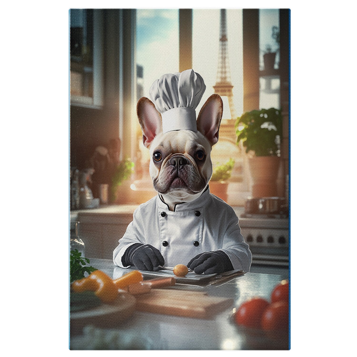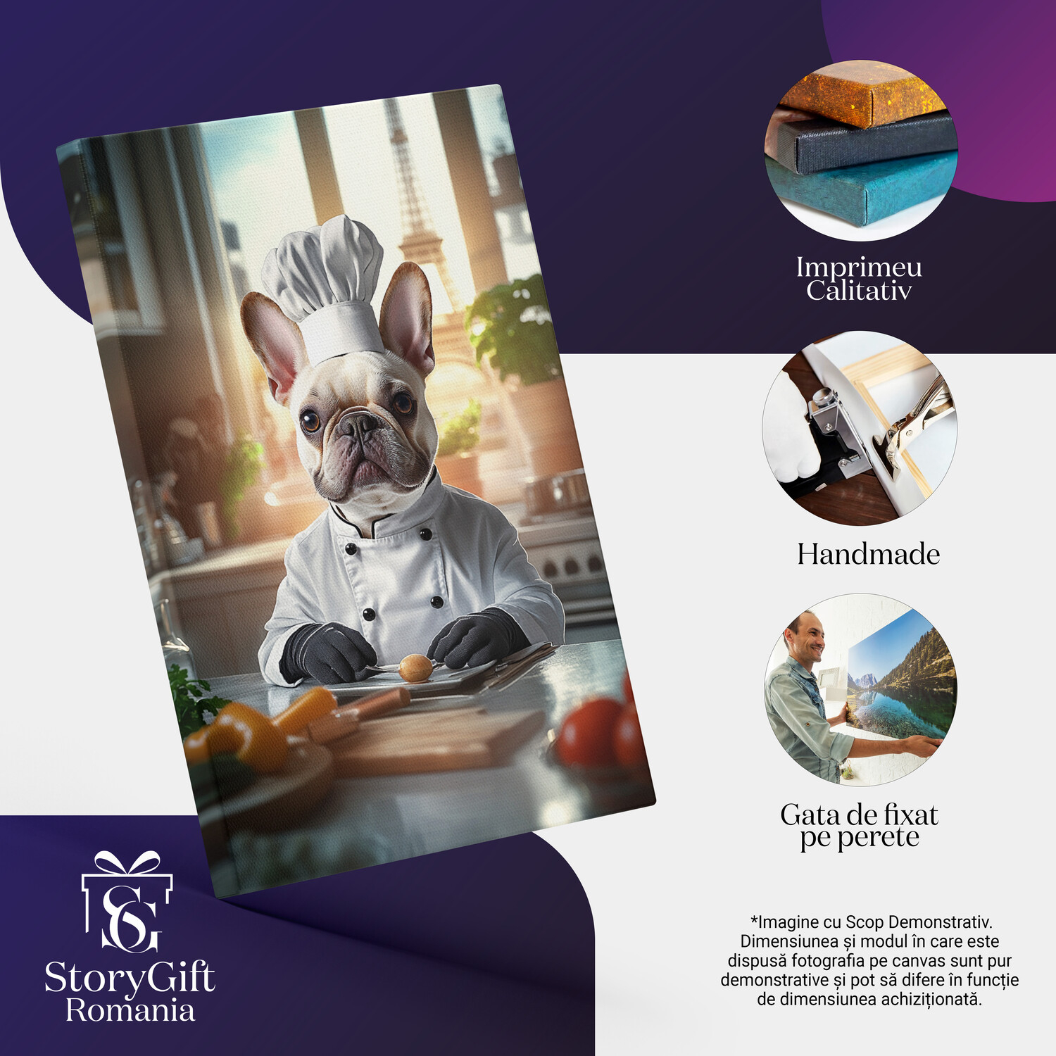 Tablou Canvas Personalizat Bucatar Cheff In Paris, Tinuta Clasica Cu Halat Si Palarie Albe, View Turnul Eiffel. Meserie 40x25CM