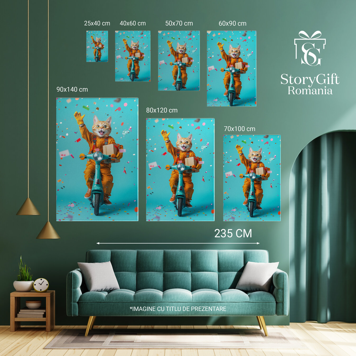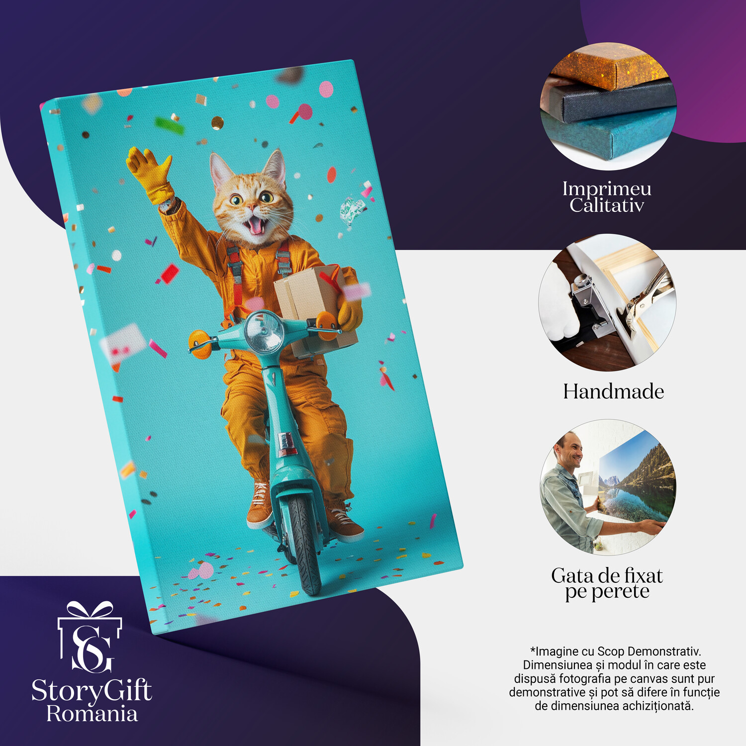 Tablou Canvas Personalizat Curier Pe Scuter Cu Salopeta Portocalie Si Cutie De Carton In Mana, Meserie, Postas, Comenzi Online 40x25CM