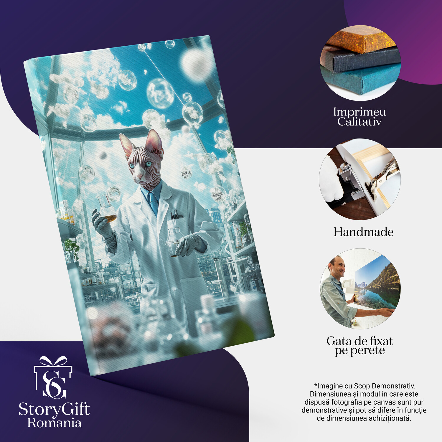 Tablou Canvas Personalizat Geniu In Laborator De Sticla, Chimist Experimente, Halat Alb Cu Camasa Si Cravata Albastra 40x25CM