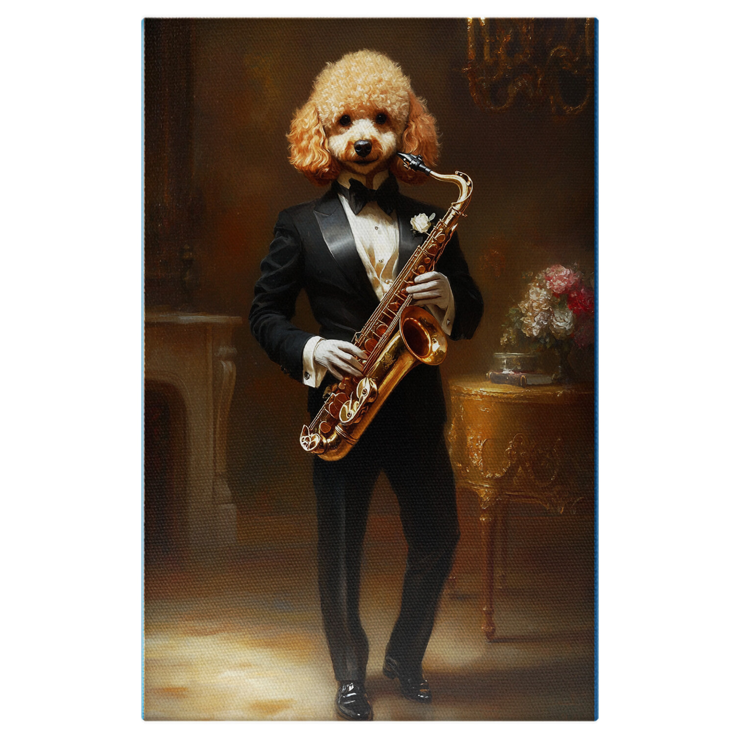 Tablou Canvas Personalizat Muzician Regal In Costum Negru Clasic Cu Papio Si Saxofon Argintiu, In Palat Rege, Muzica 100x70CM
