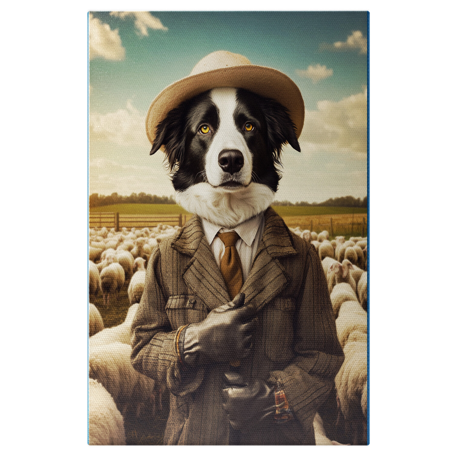 Tablou Canvas Personalizat Pastor De Oi Pe Camp, Tinuta Interbelica Palarie de Paie Cu Sacou Si Crava Rosie, Cioban, Natura 100x70CM
