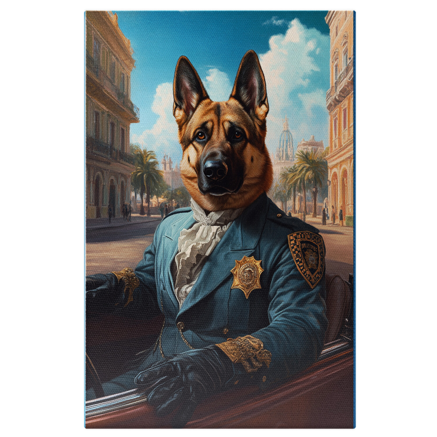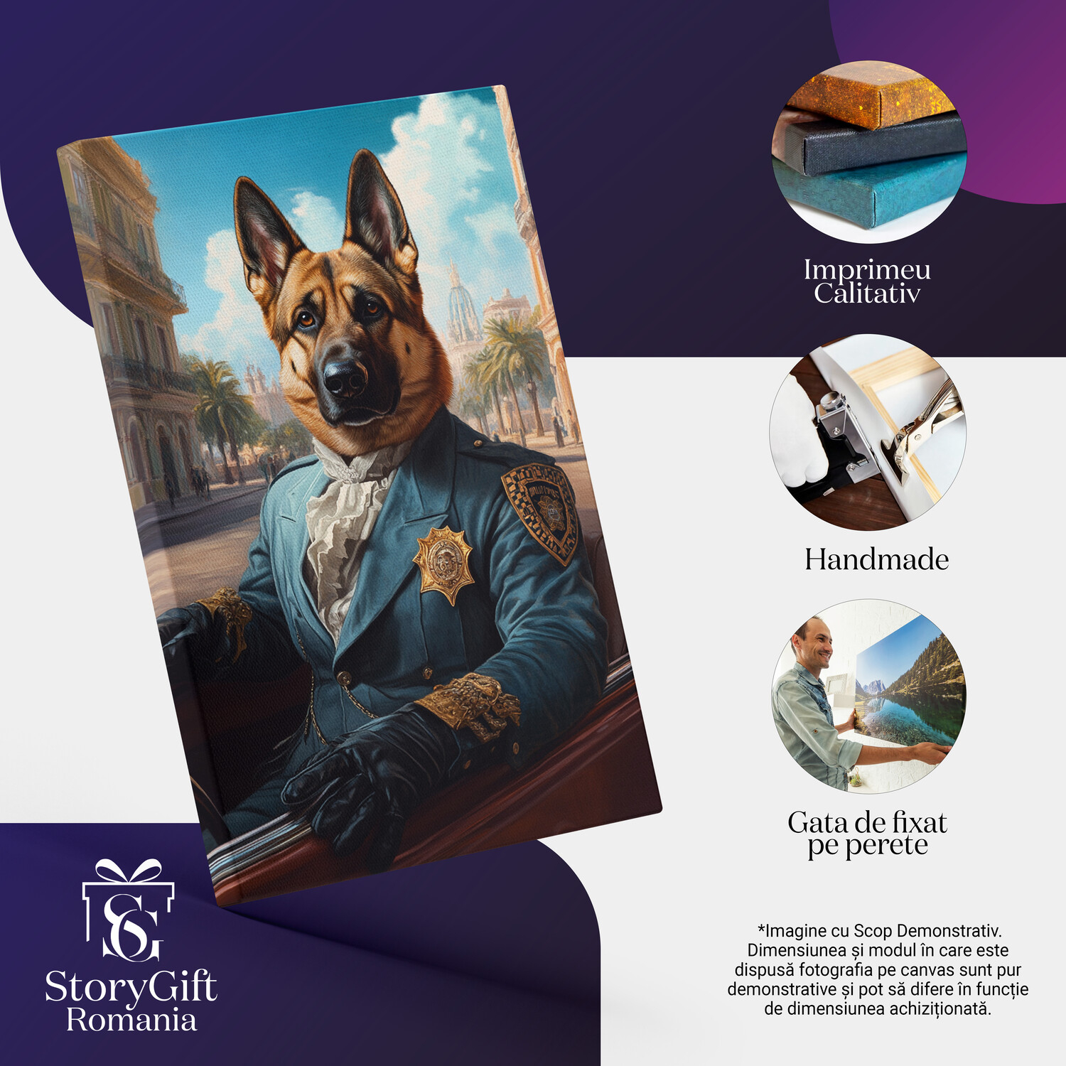 Tablou Canvas Personalizat Politist Regal Cu Tinuta Albastra Cu Camasa Alba Cu Guler inalt Si Volane, Detalii Aurii 120x80CM