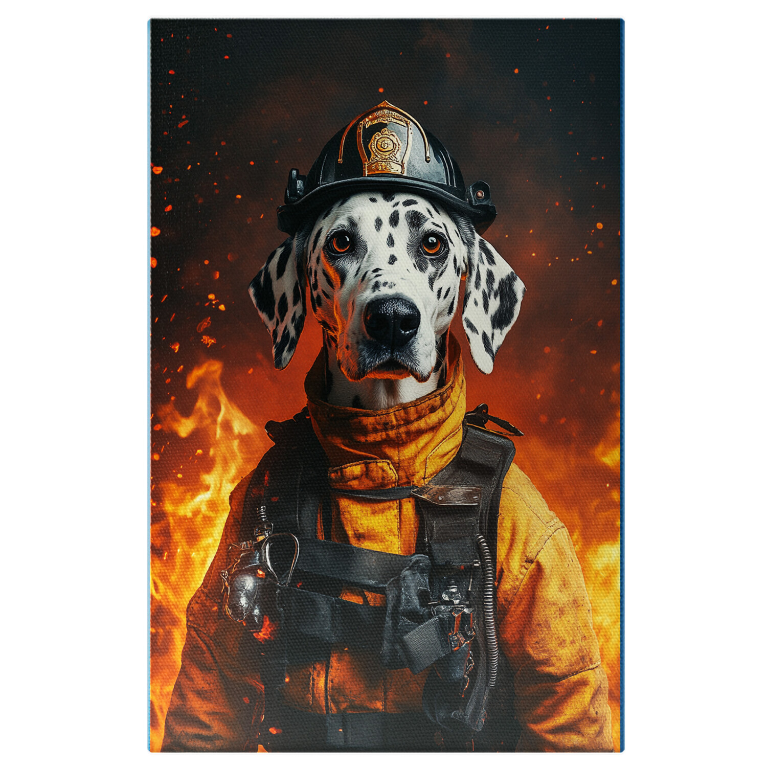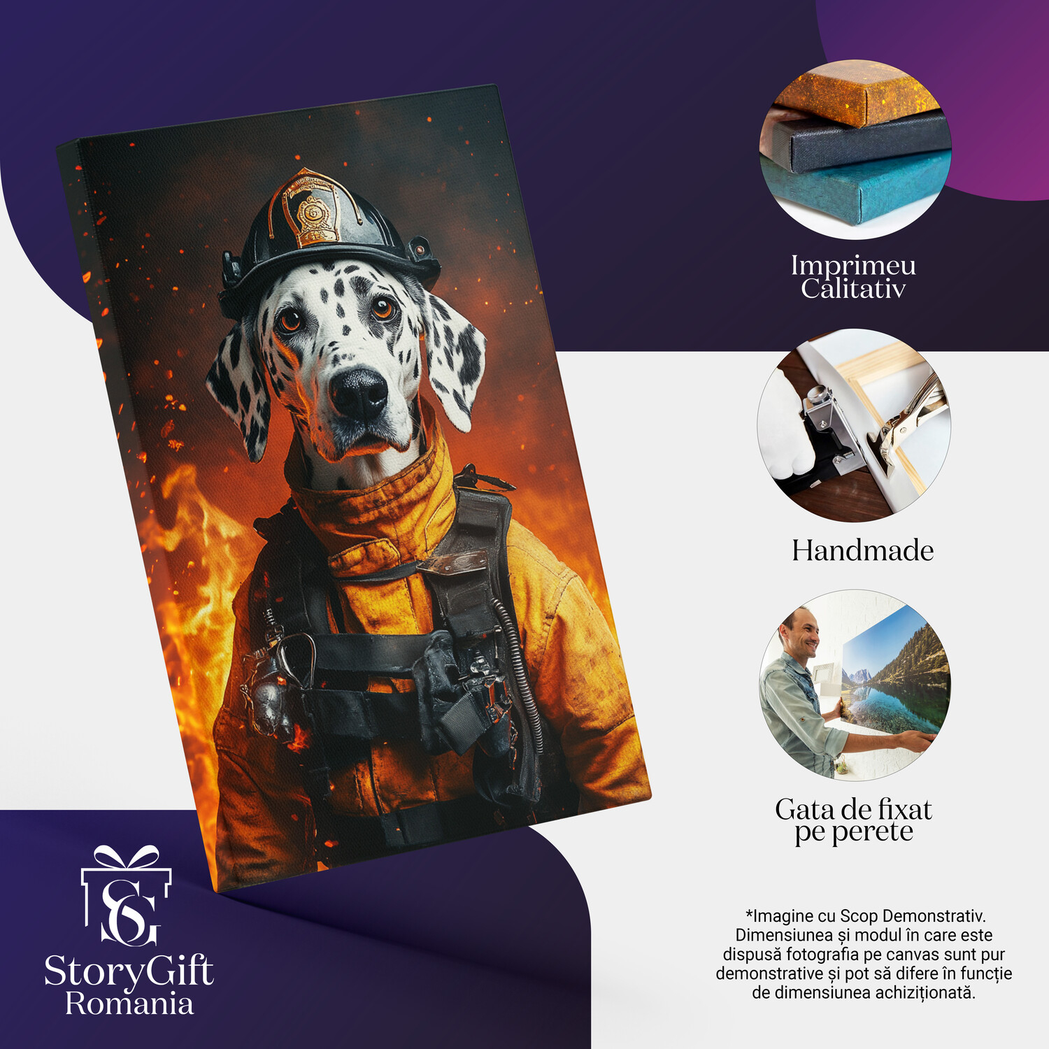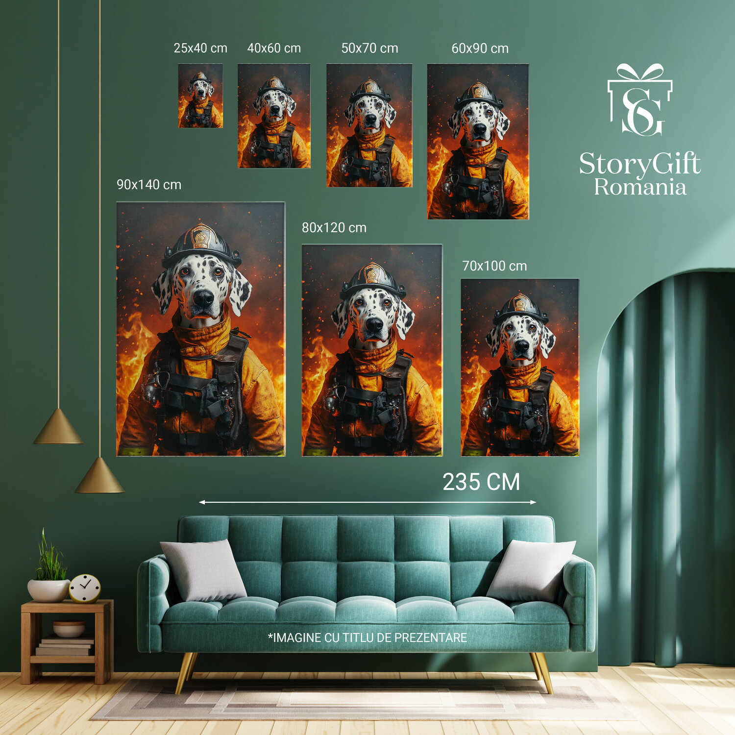 Tablou Canvas Personalizat Pompier Intre Flacari, Uniforma Galbena Cu Vesta Cu Instrumente, Palarie De Protectie 90x60CM