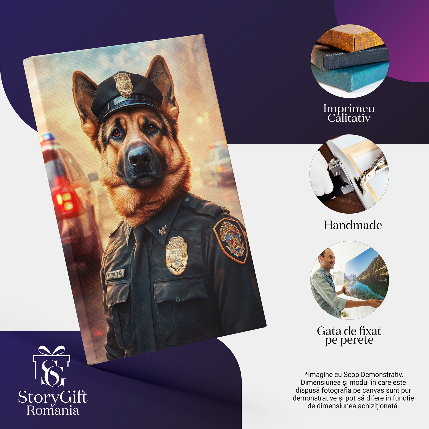 Tablou Canvas Personalizat Portret Politist In Uniforma neagra, Cravata Si Insigna De Aur, Palarie Clasica, Apus De Soare 40x25CM