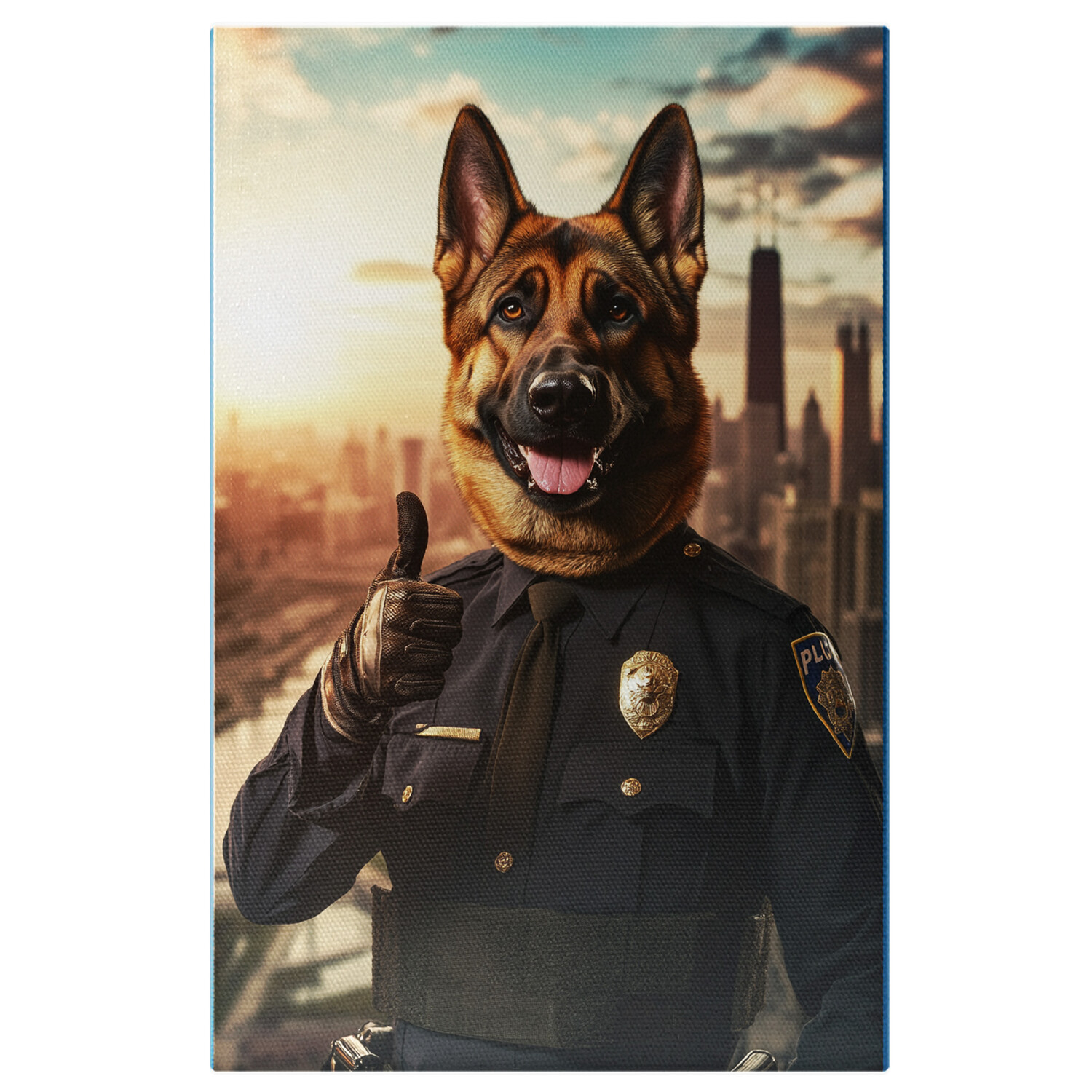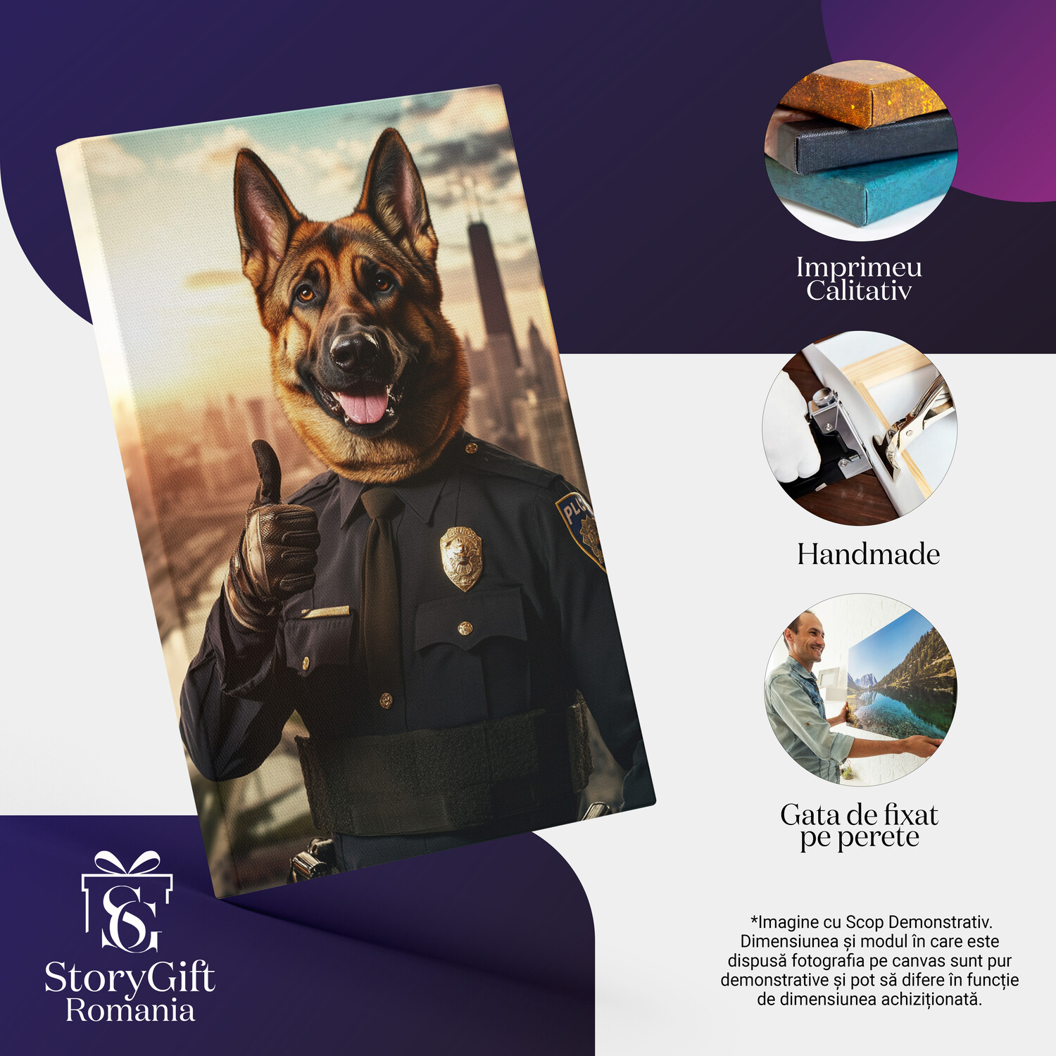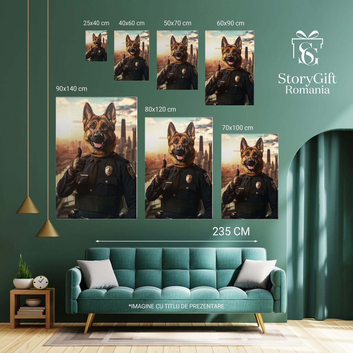 Tablou Canvas Personalizat Portret Politist In Uniforma neagra, Cravata Si Insigna De Aur, PaVesel Aratand Semnul Ok 120x80CM