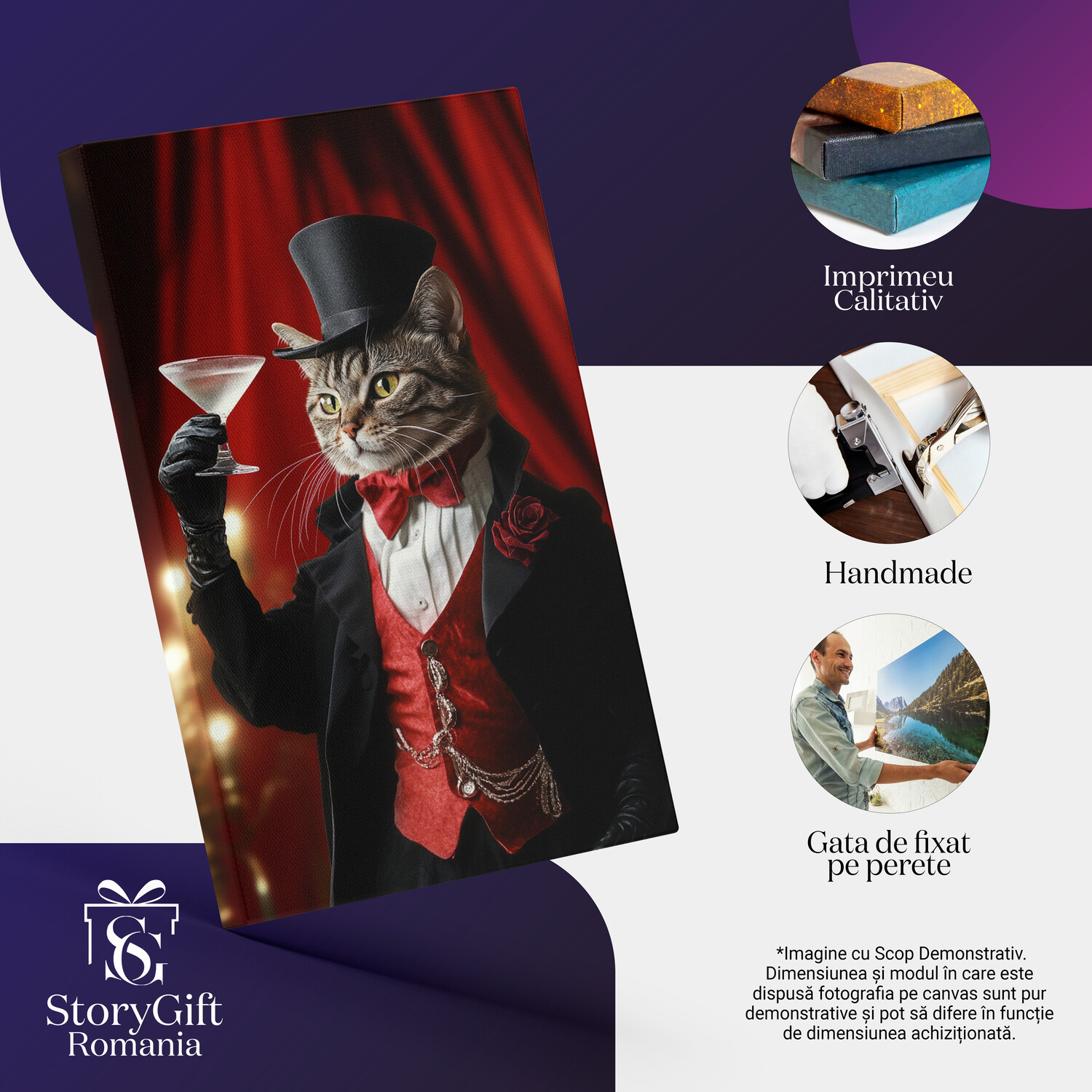 Tablou Canvas Personalizat Tinuta De Magcian Modern, Palarie Inalta, Palton Negru Cu Vesta Rosie, Pahar 90x60CM