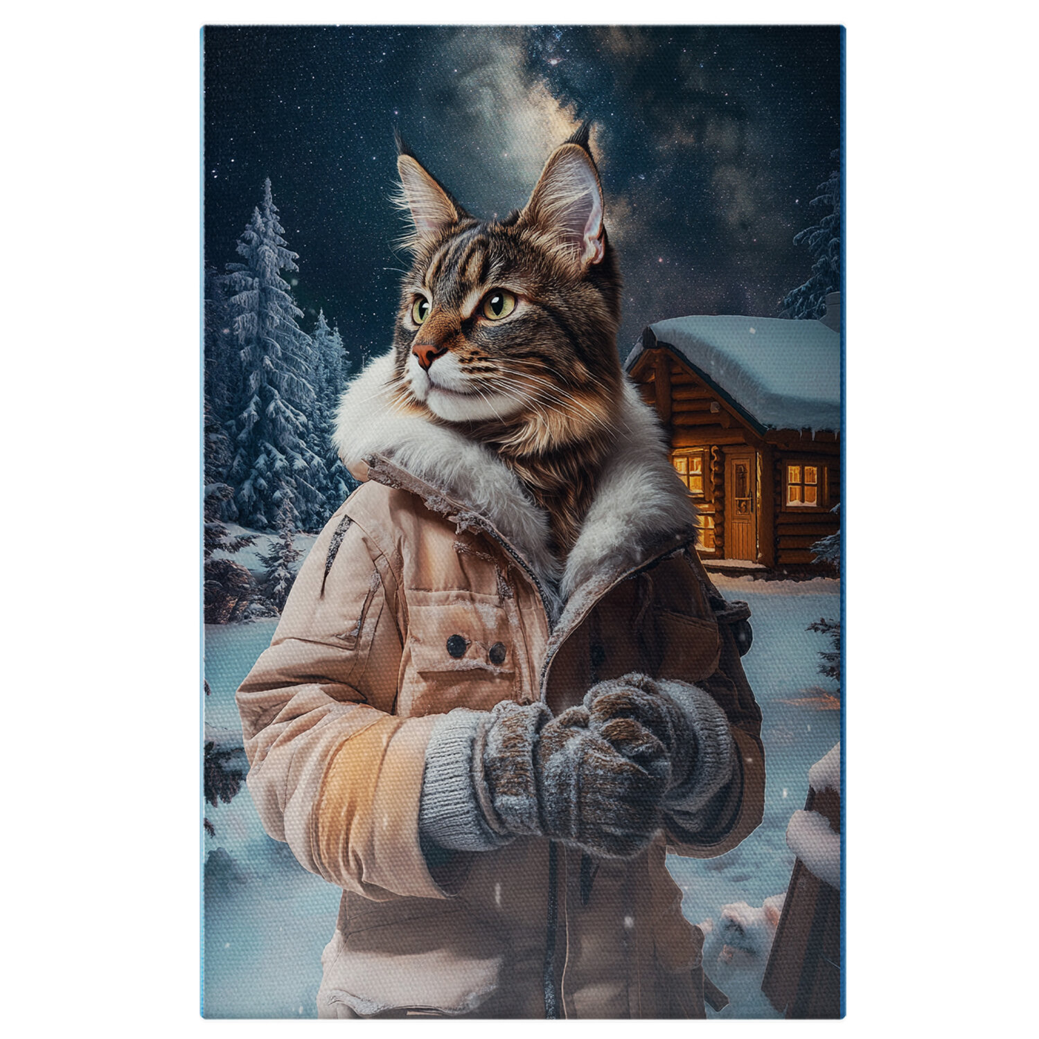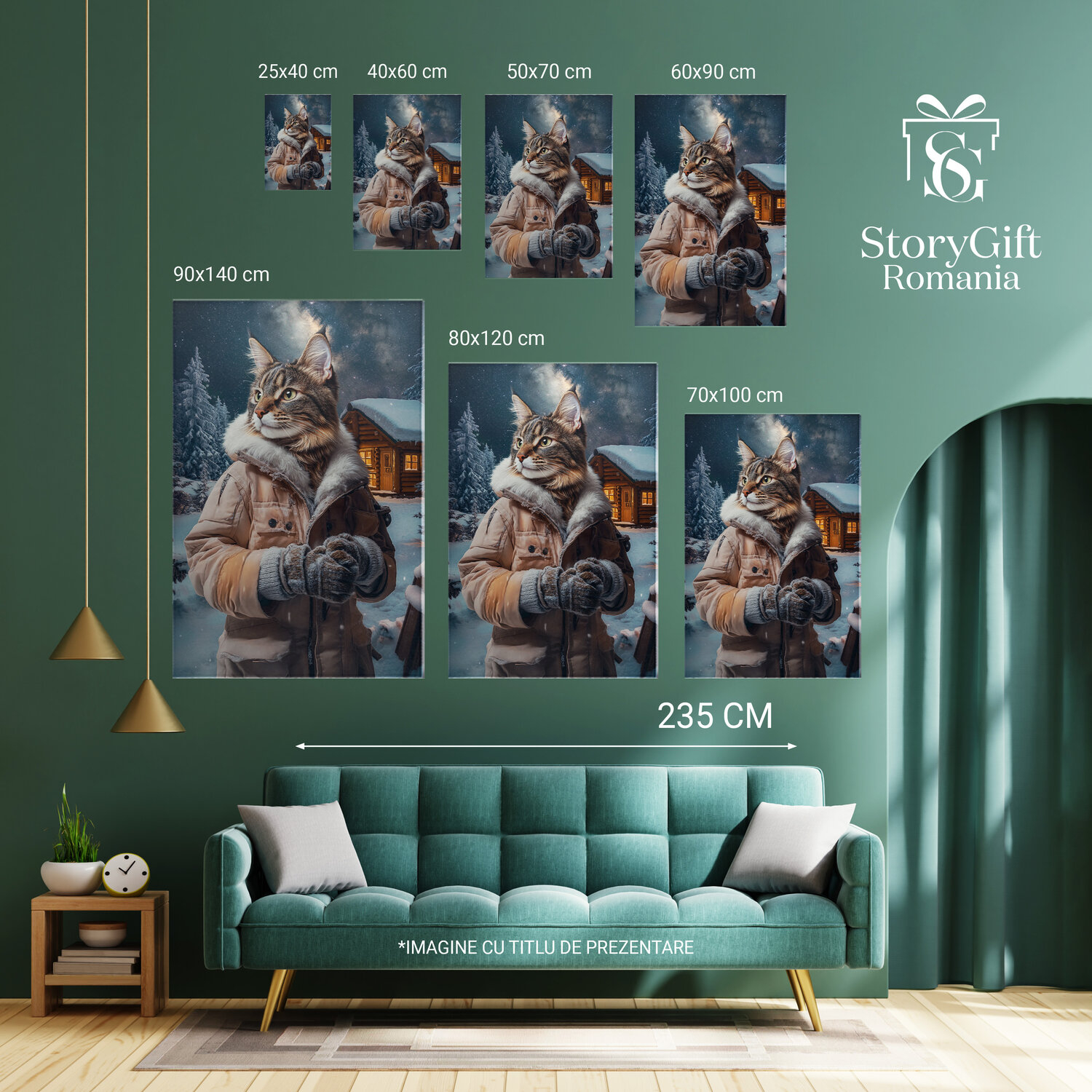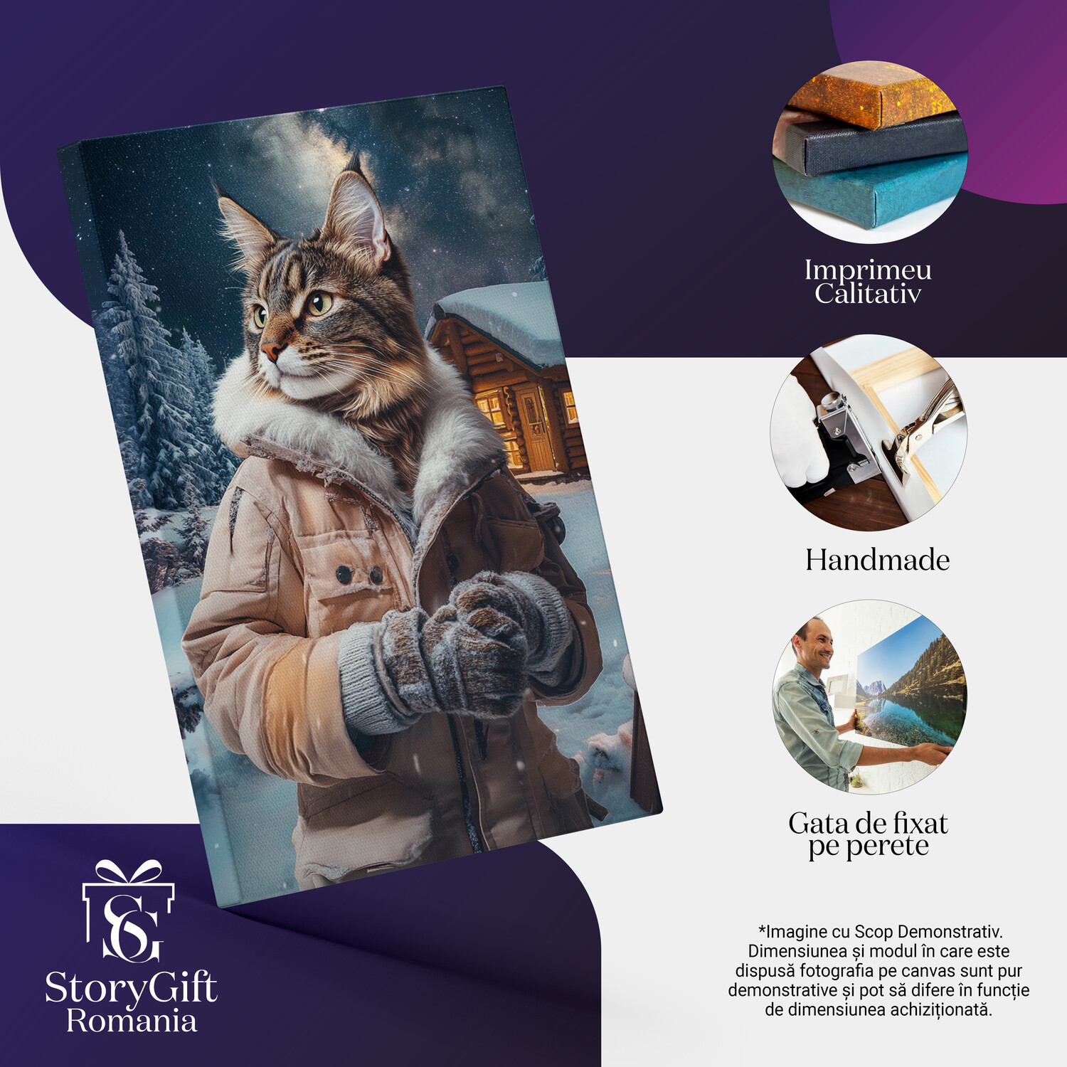 Tablou Canvas Personalizat Cabana In Munte Inghetata, Portret Cu Jacheta Galbena Cu Blana Si Manusi Crosetate 40x25CM
