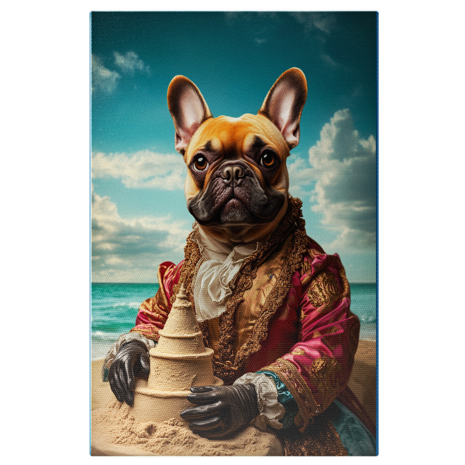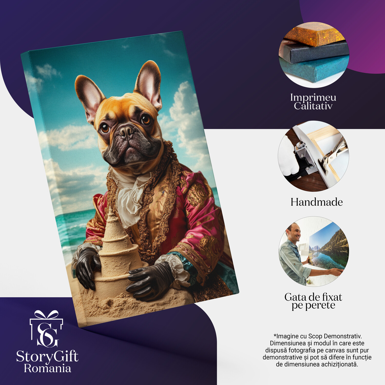 Tablou Canvas Personalizat Conte regal Pe Plaja Construin Castele De Nisip, Tinuta Eleganta regala Rosie Si Albastra, Guler Inalt stil ruff 40x25CM