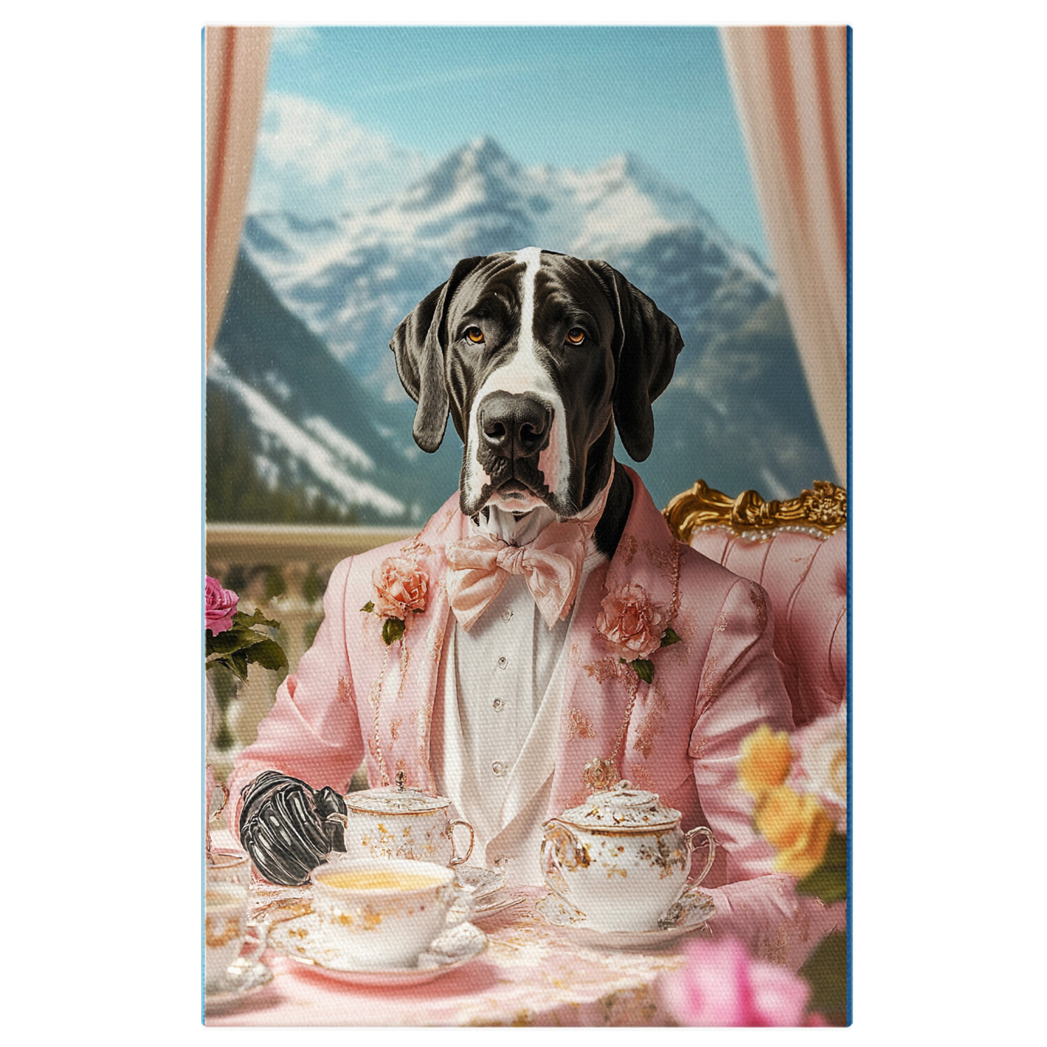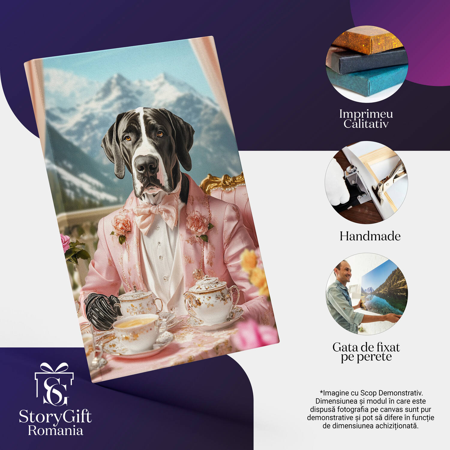 Tablou Canvas Personalizat Timpul Ceaiului Cu Regele In Costum Roz Pudra, Papion Si trandafiri, View Montan, Vesela Stralucitoare 40x25CM
