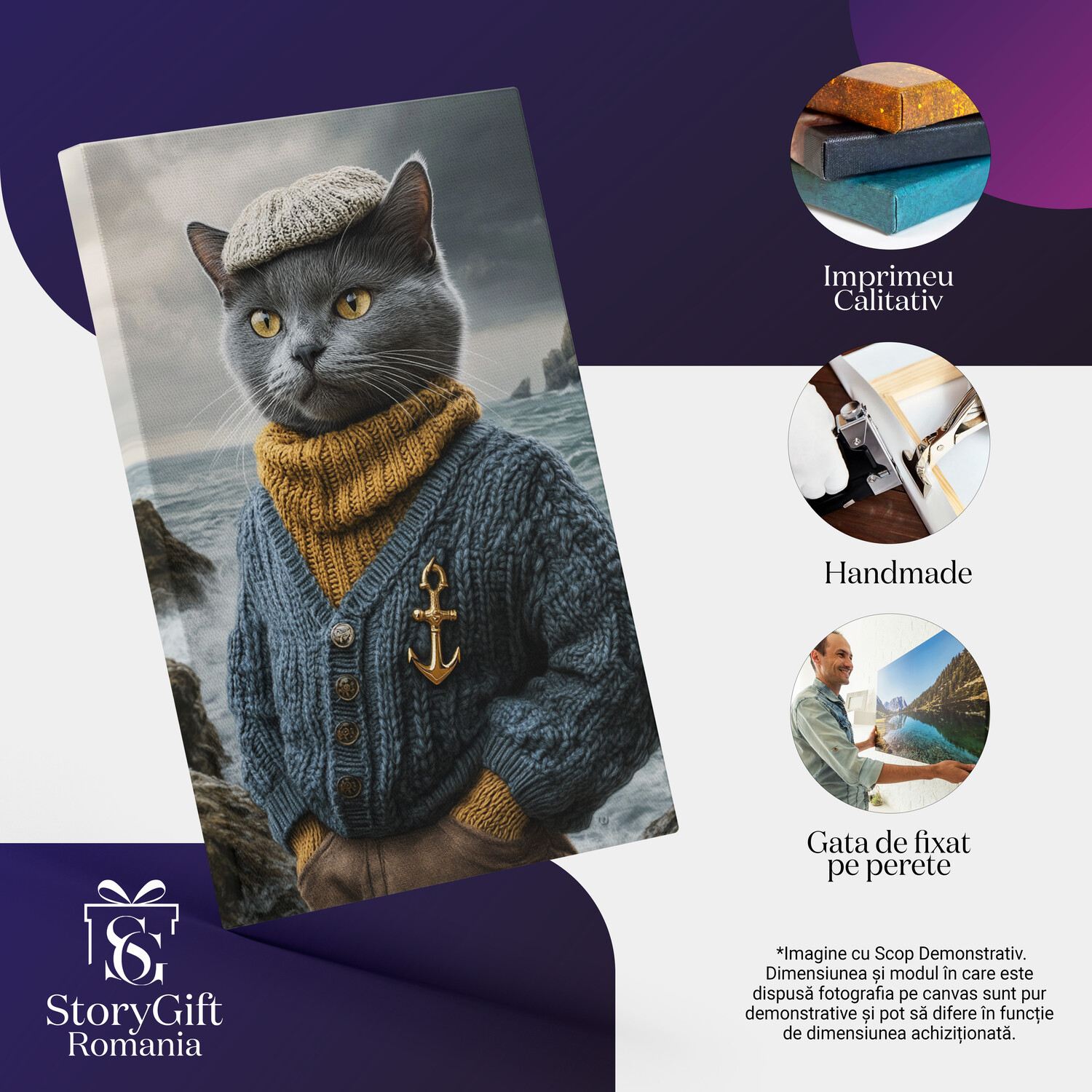 Tablou Canvas Personalizat Tinuta Moderna Stradala Din Lana Crosetata, Palarie Gri, Pulover Cu Guler Inlat Si Cardigan Albastru, La Malul Marii, Cer Innorat 40x25CM