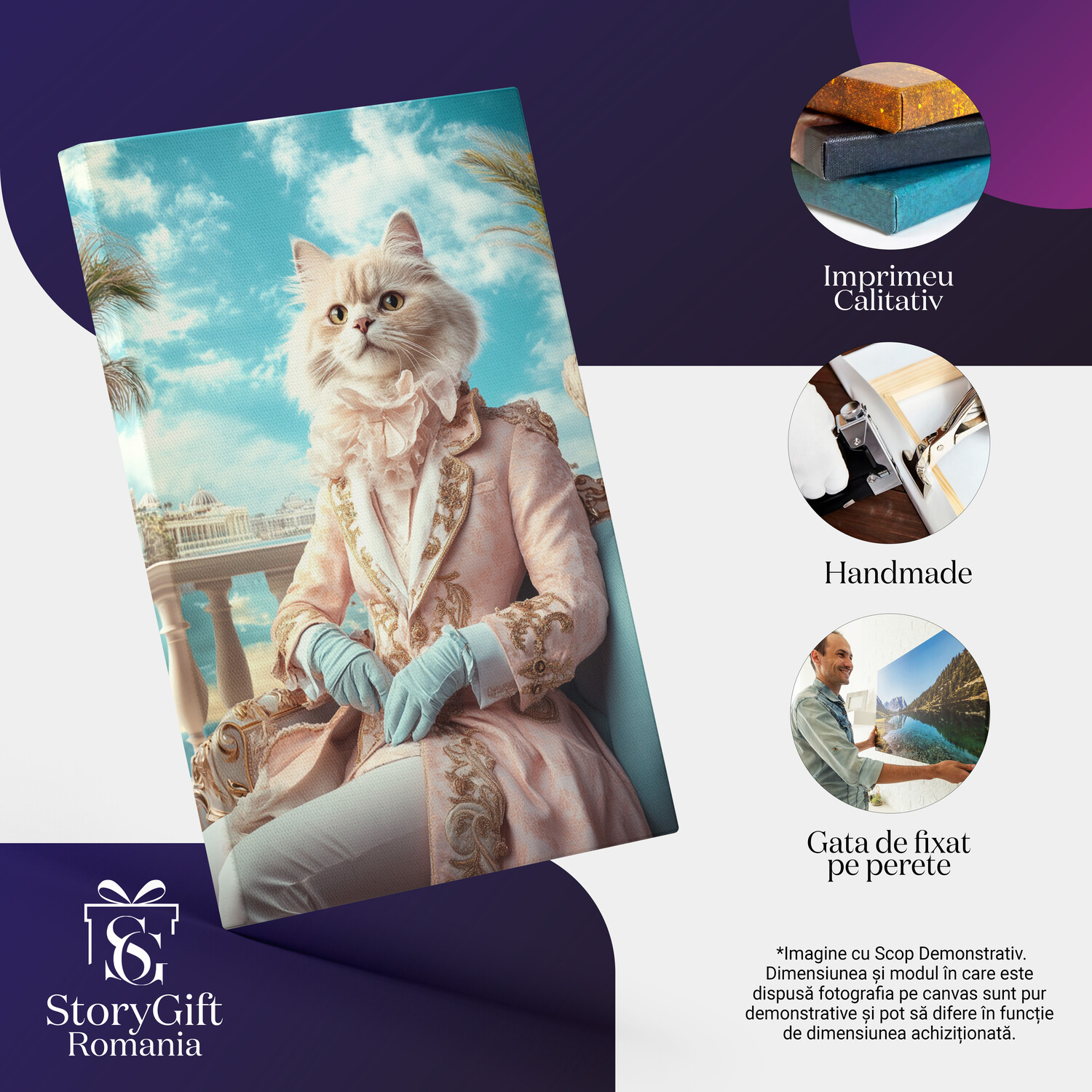 Tablou Canvas Personalizat Conte regal pe fotoliu balcon, f=view Roma, tinuta eleganta roz, jupon cu detalii aurii, manusi albastre, guler inalt stil ruff 40x25CM