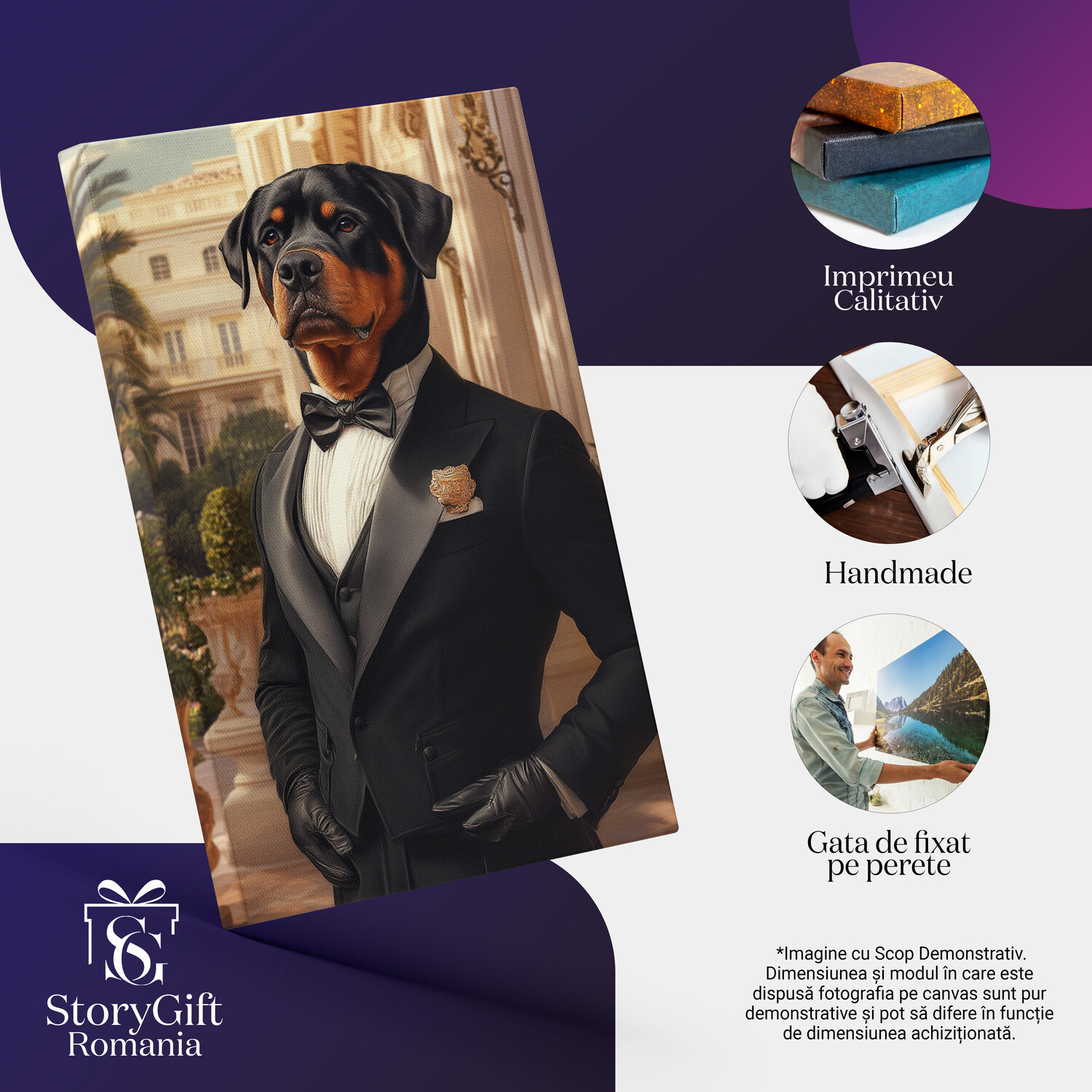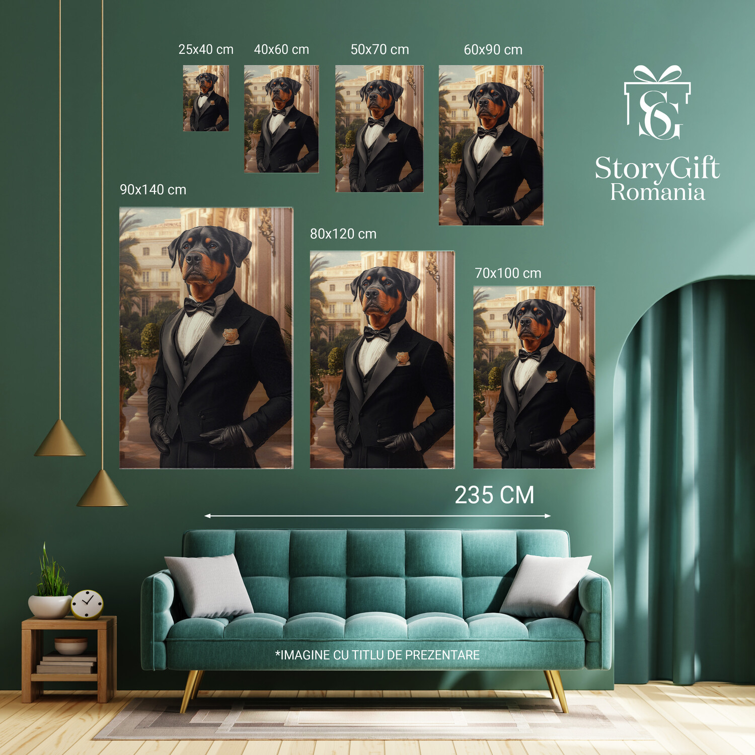 Tablou Canvas Personalizat Costum negru clasic cu papion floare roz in piept, manusi de piele, in curtea palatului, stil regal 40x25CM