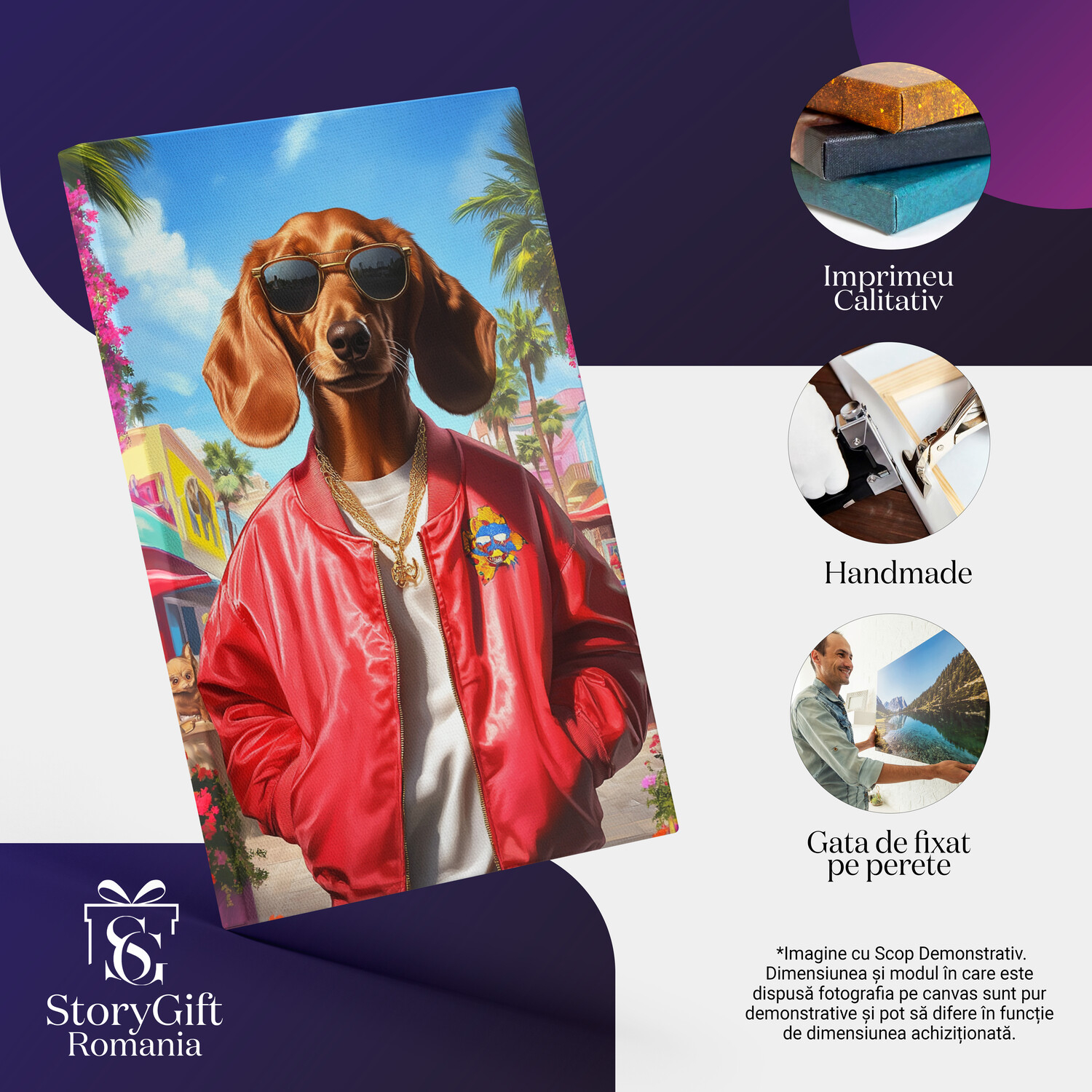 Tablou Canvas Personalizat Tinuta moderna stil stradal Hip-Hop, jacheta oversize rosie cu medalion masiv de aur, tricou alb, in oras LA 40x25CM