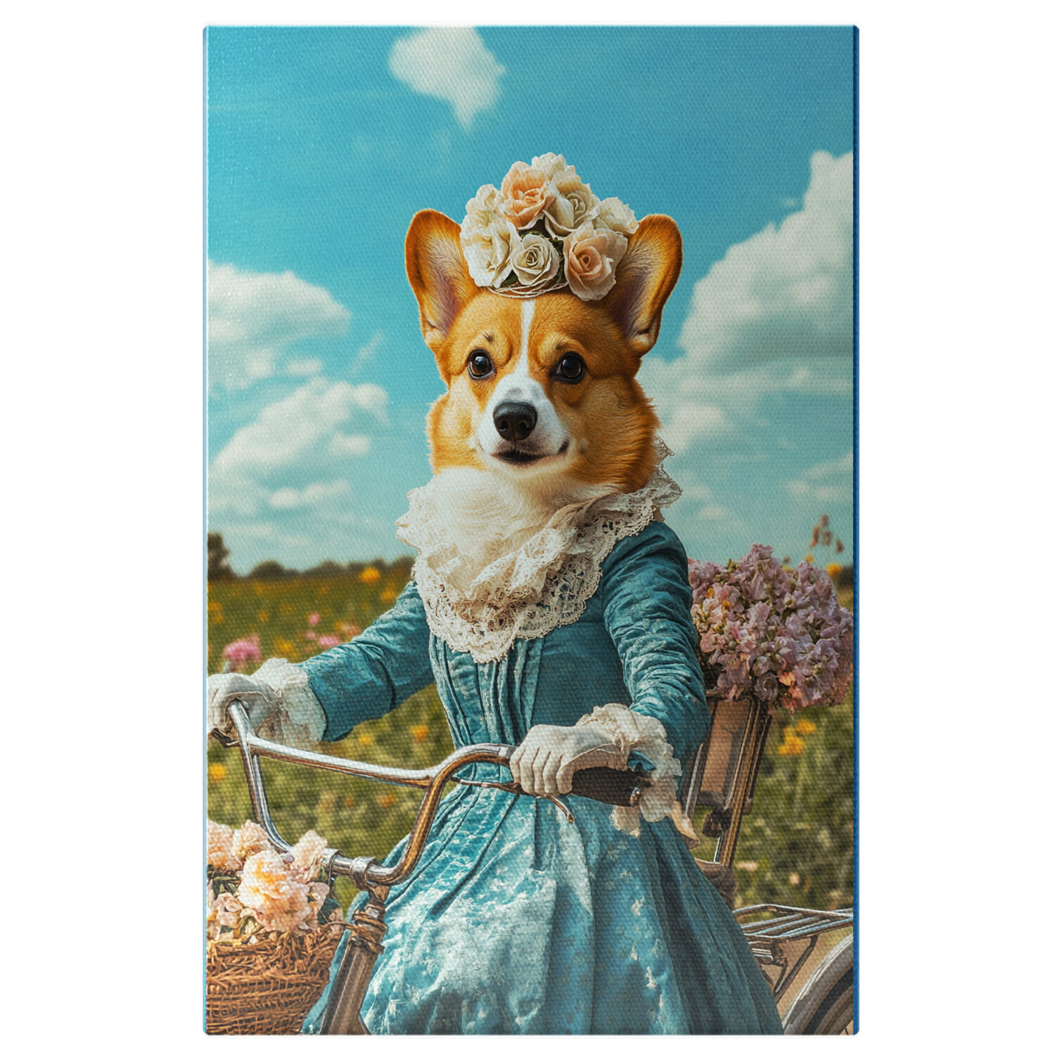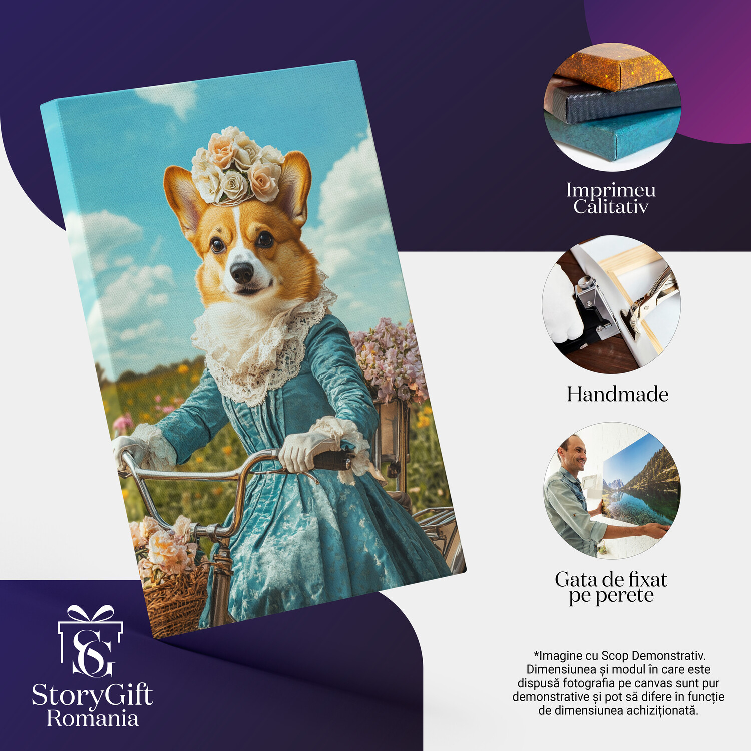 Tablou Canvas Personalizat Contesa regala pe bicicleta in livada, rochie aristrocrata albastra cu detalii din dantela alba, coroana de flori 70x50CM
