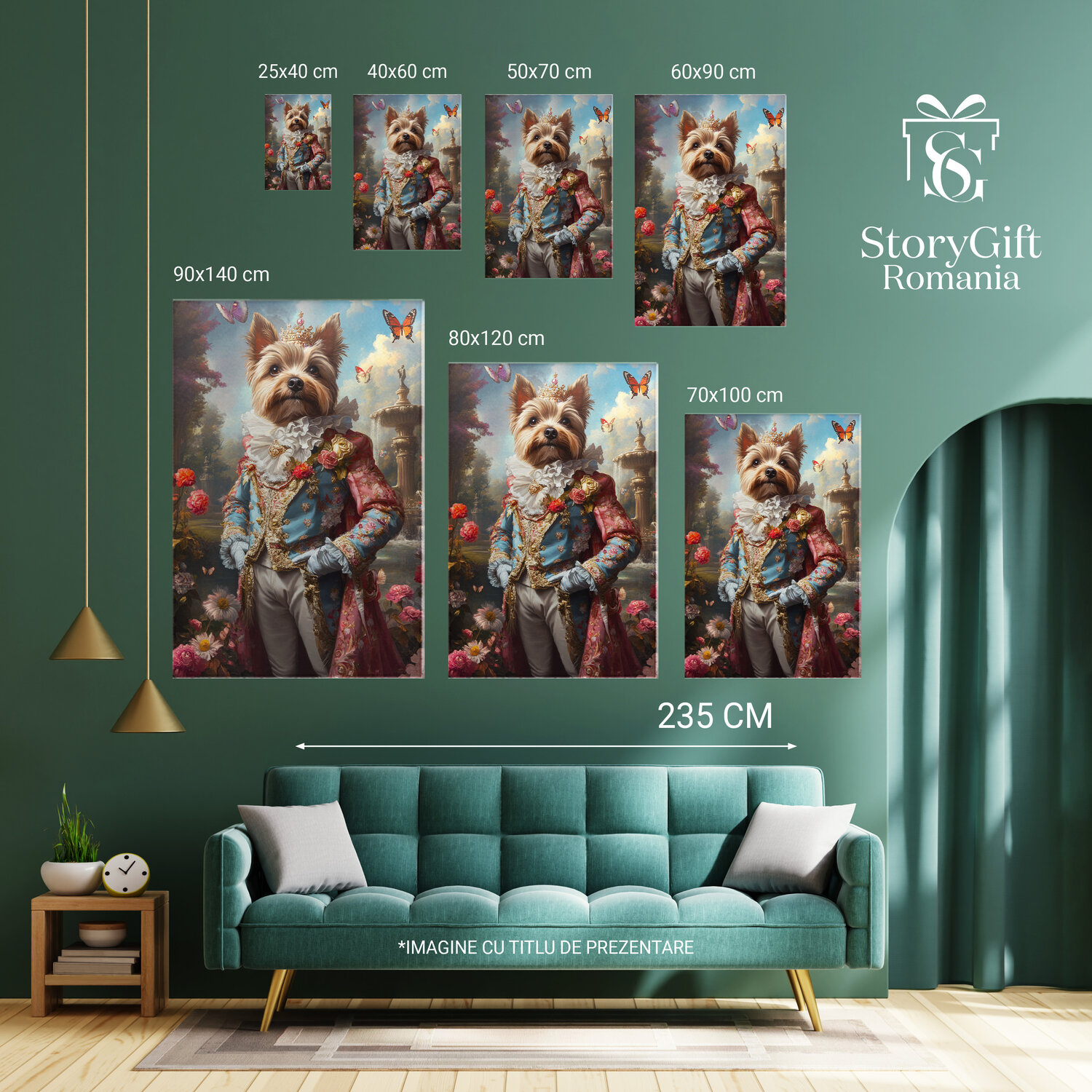 Tablou Canvas Personalizat Rege in gradina castelului,, cu tinuta eleganta cu jacheta albastra si capa roz bogata in detalii de aur, guler inalt stil ruff, fluturi colorati 40x25CM