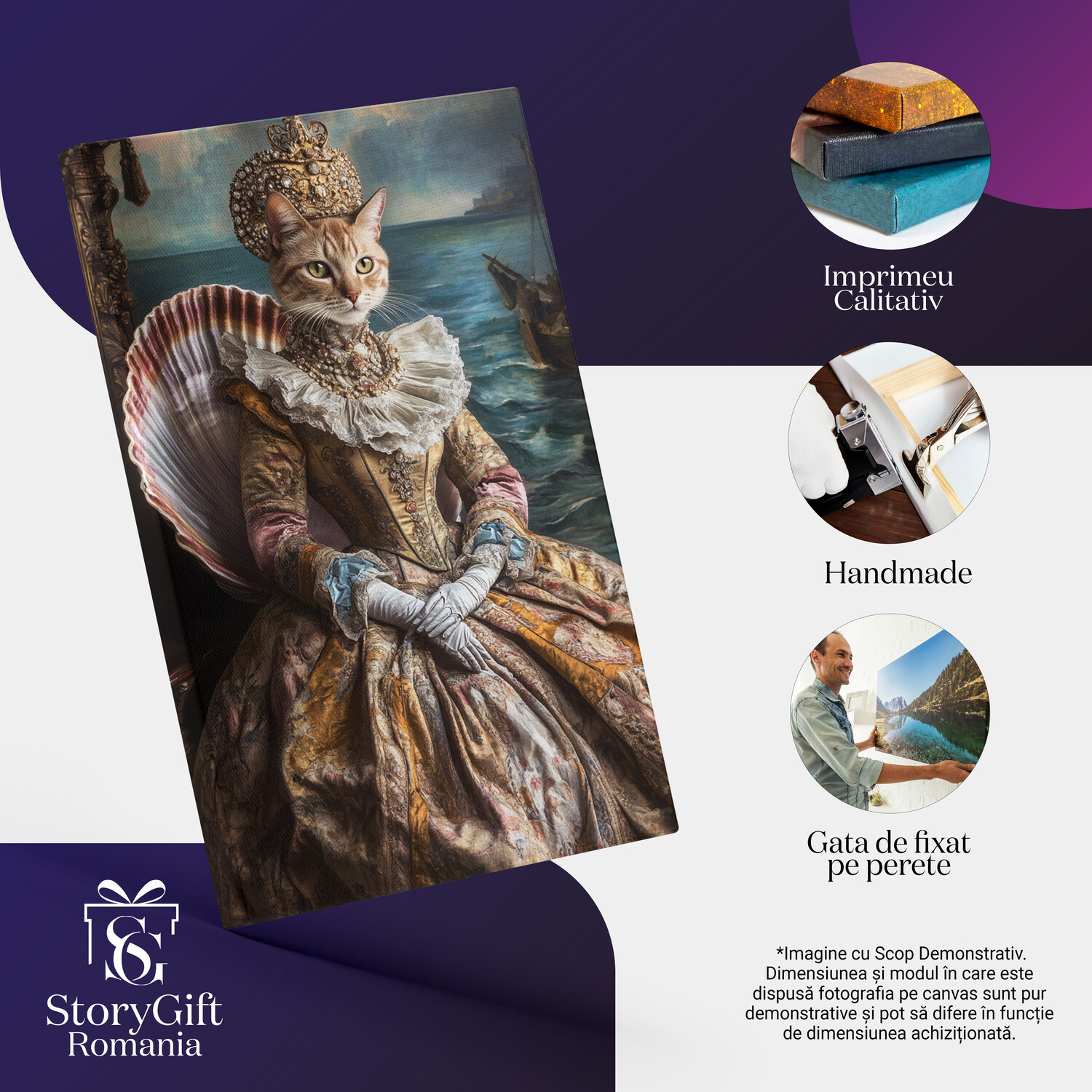 Tablou Canvas Personalizat Regina pe tronul scoica langa mare albastra, rochie regala galbena cu detalii metal, guler amplu din dantela, coliere din perle 40x25CM