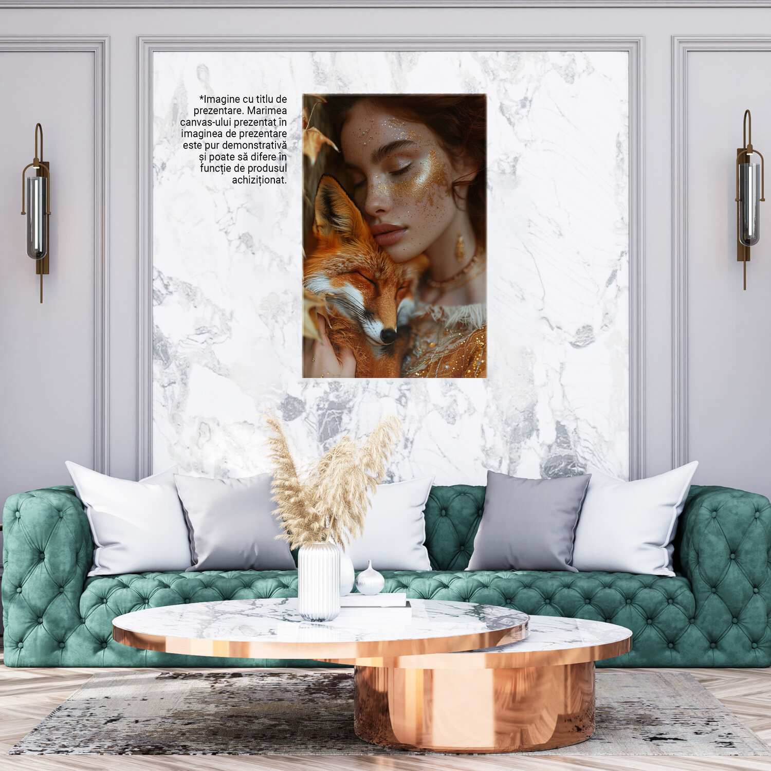 Tablou Canvas Animalul de Companie o Vulpe Frumoasa Alaturi de Stapana ei cu Sclipici pe Fata si Parul Roscat , Pictura Digitala 40x25CM