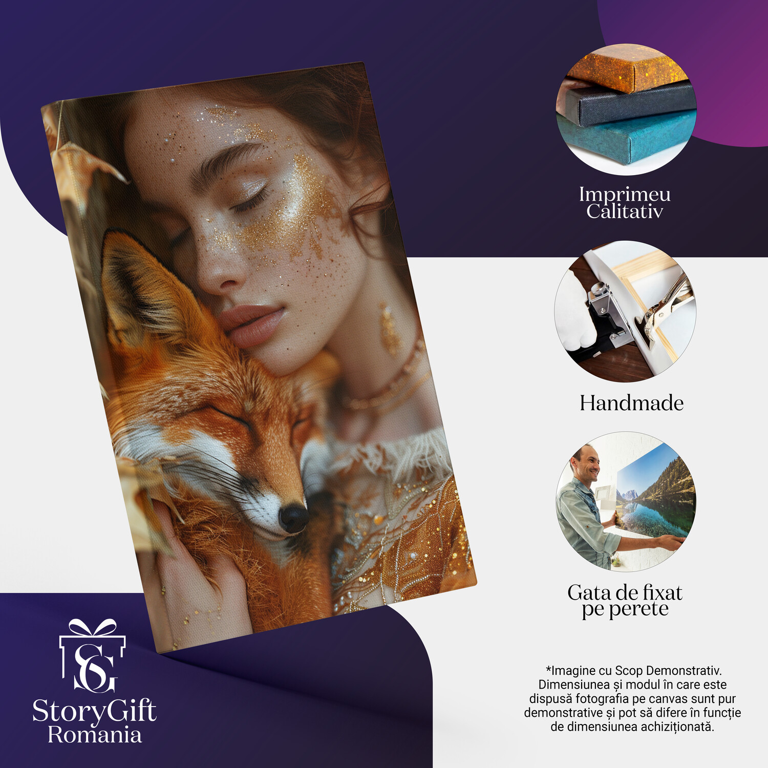 Tablou Canvas Animalul de Companie o Vulpe Frumoasa Alaturi de Stapana ei cu Sclipici pe Fata si Parul Roscat , Pictura Digitala - Tablou Canvas Signature de la StoryGift Romania