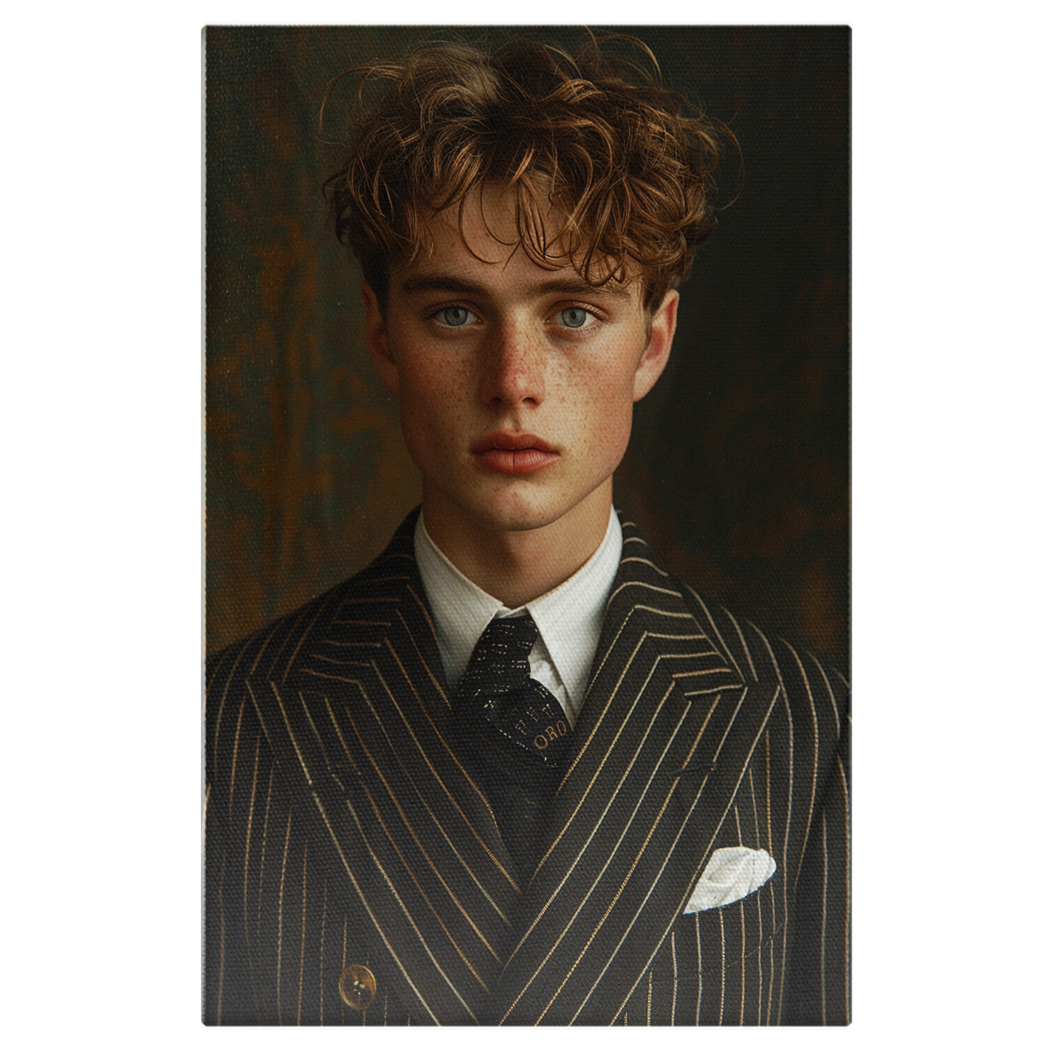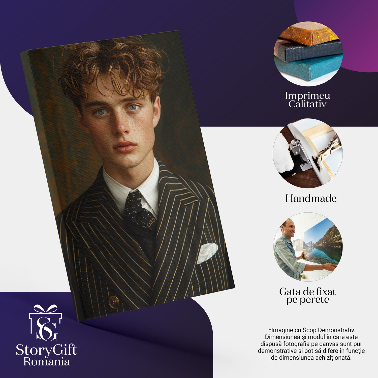 Tablou Canvas Baiat Chipes cu Ochii Luminati si Pistrui cu Parul Saten in Camasa Alba cu Cravata si Sacou Dungat , Pictura Digitala - Tablou Canvas Signature de la StoryGift Romania