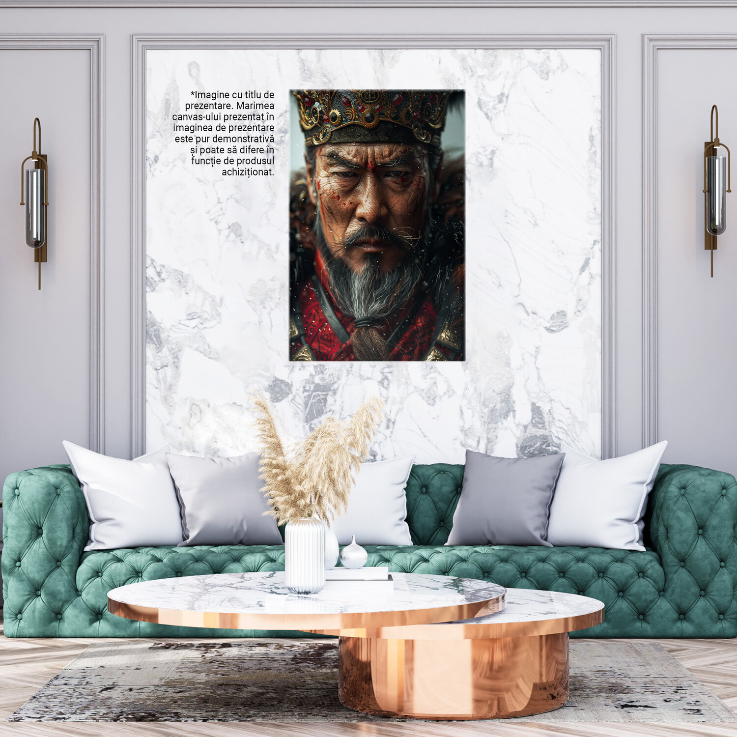 Tablou Canvas Barbat Japonez Shogun cu Taieturi pe Fata cu Barba Carunta in Costum Rosu cu Coroana , Pictura Digitala - Tablou Canvas Signature de la StoryGift Romania