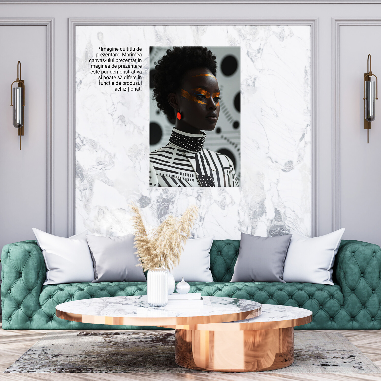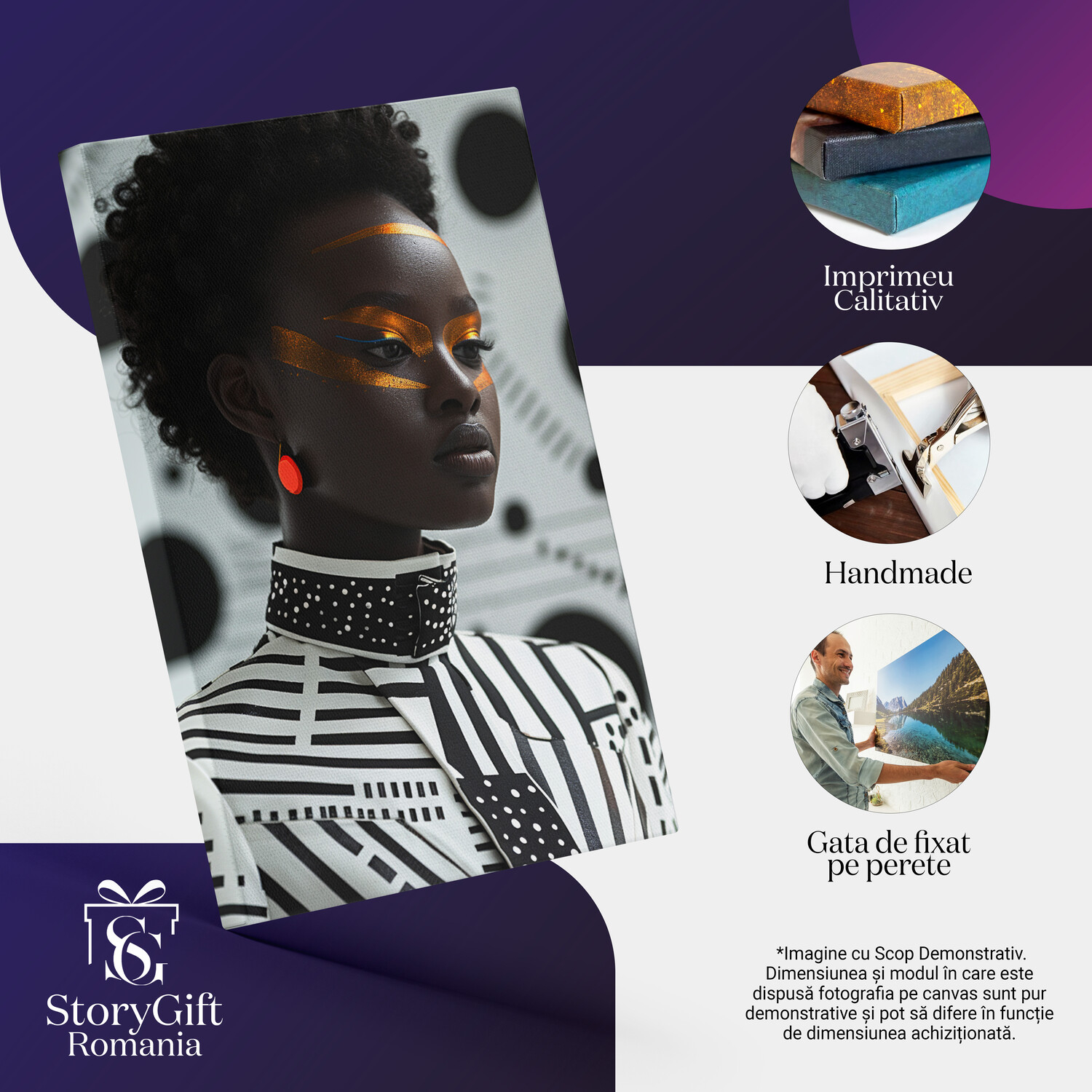 Tablou Canvas Black Elegance cu Parul Scurt Cret cu Cercei Portocali Fosforescenti si Pictura pe Fata, Femeie Negresa , Pictura Digitala - Tablou Canvas Signature de la StoryGift Romania