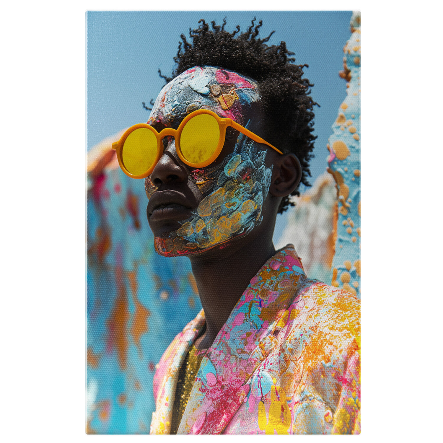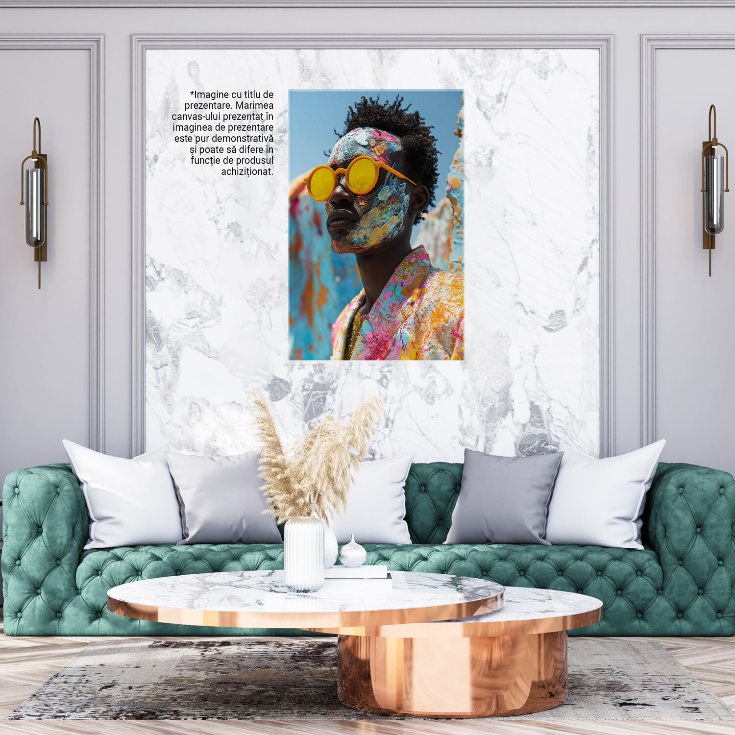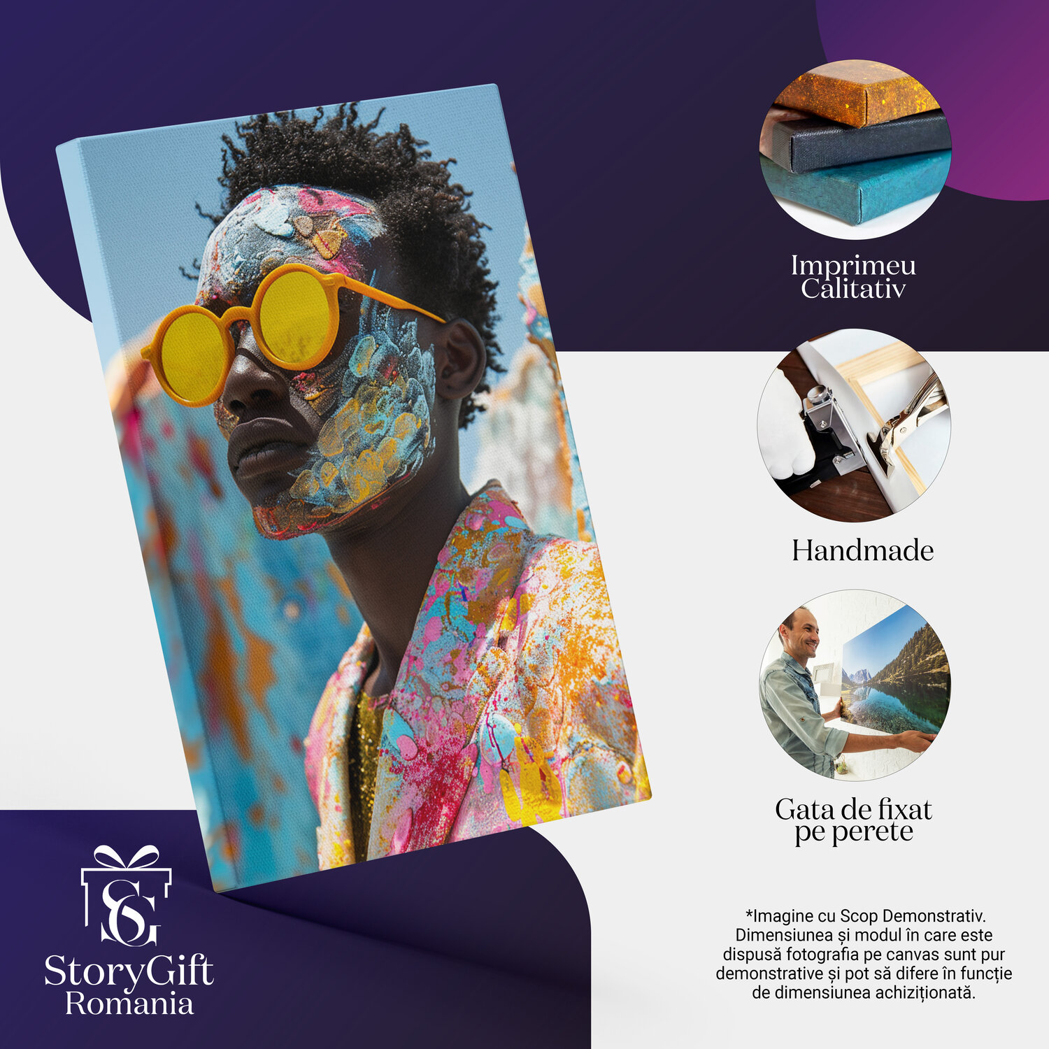 Tablou Canvas Black Man Pictat pe Fata Asortat cu Camasa si Ochelari Galbeni cu Parul Scurt Cret Negru , Pictura Digitala - Tablou Canvas Signature de la StoryGift Romania