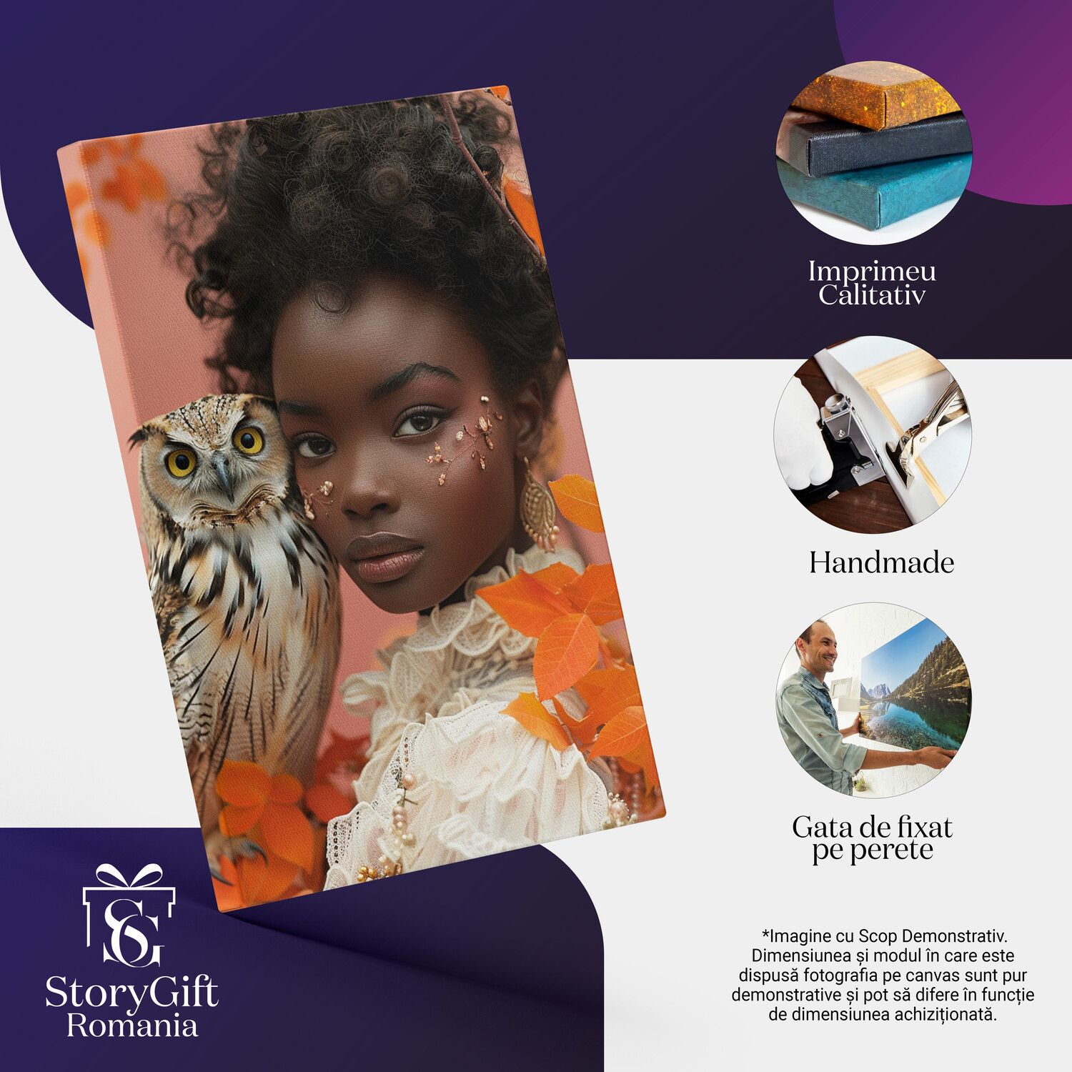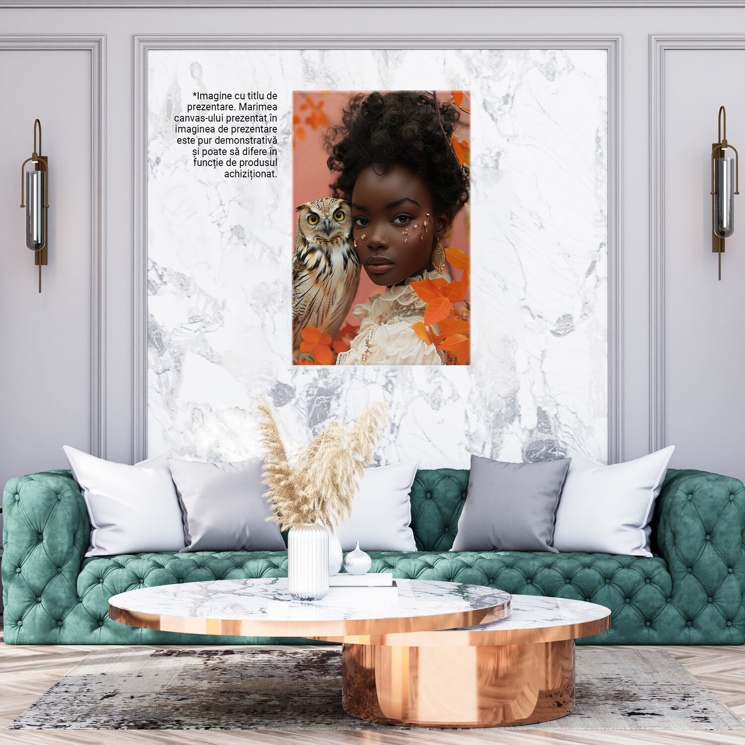 Tablou Canvas Bufnita Speriata cu Ochii Galbene sta langa Fata Negresa cu Cercei si Rochie Alba Dantelata , Pictura Digitala 40x25CM