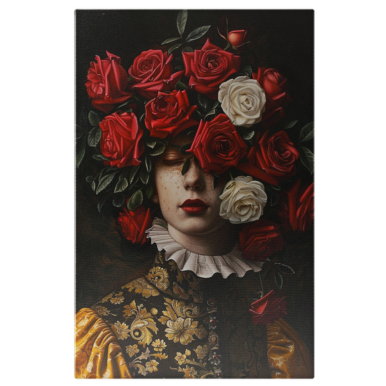 Tablou Canvas Chipul Acoperit de Trandafiri Albi si Rosii cu Rujul Rosu in Fochie Galben Aurie cu Pistrui , Pictura Digitala - Tablou Canvas Signature de la StoryGift Romania
