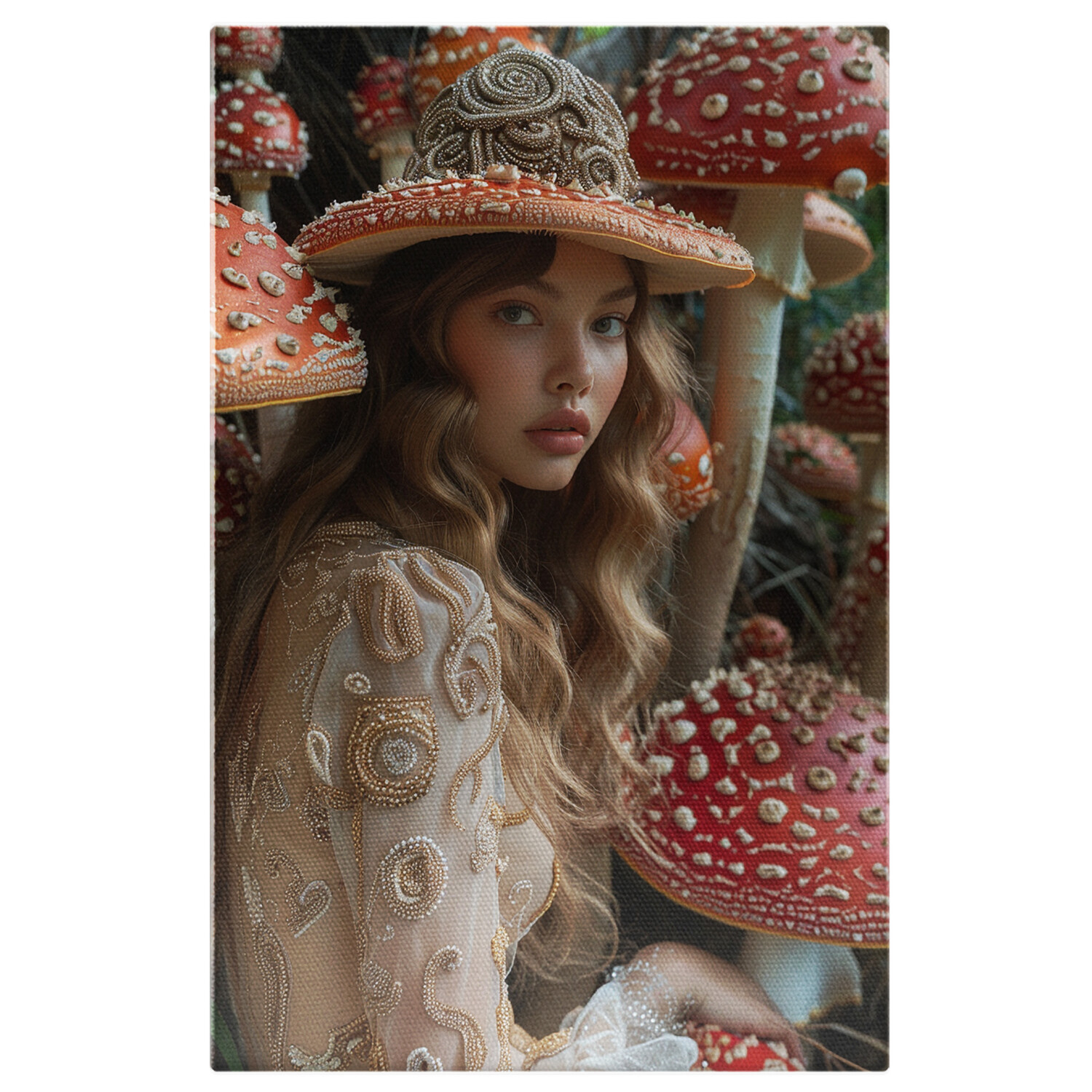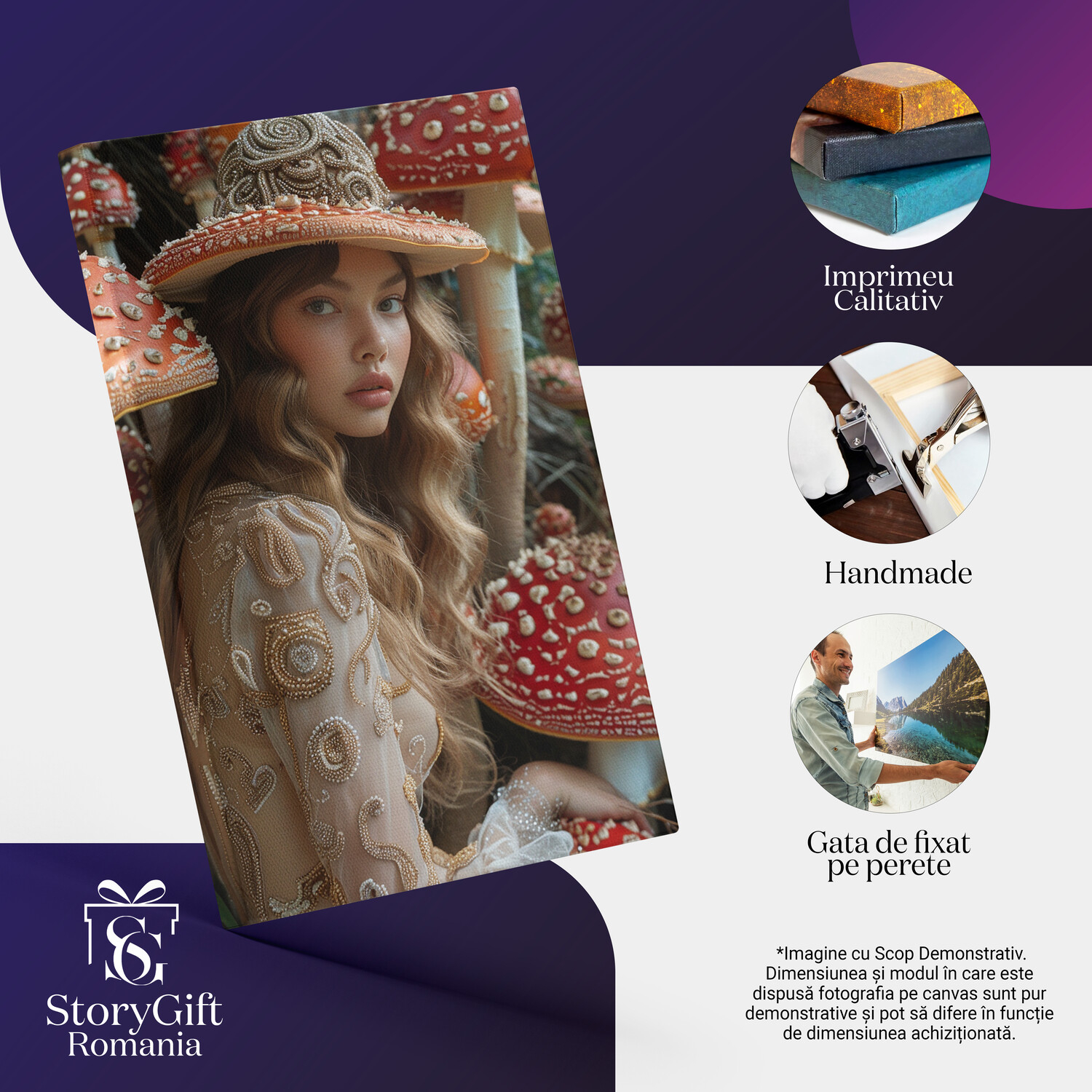 Tablou Canvas Ciupercile Rosii Gigantice langa car sta Fata cu Palarie in Rochie cu Parul Ondulat si Chip Senin , Pictura Digitala - Tablou Canvas Signature de la StoryGift Romania